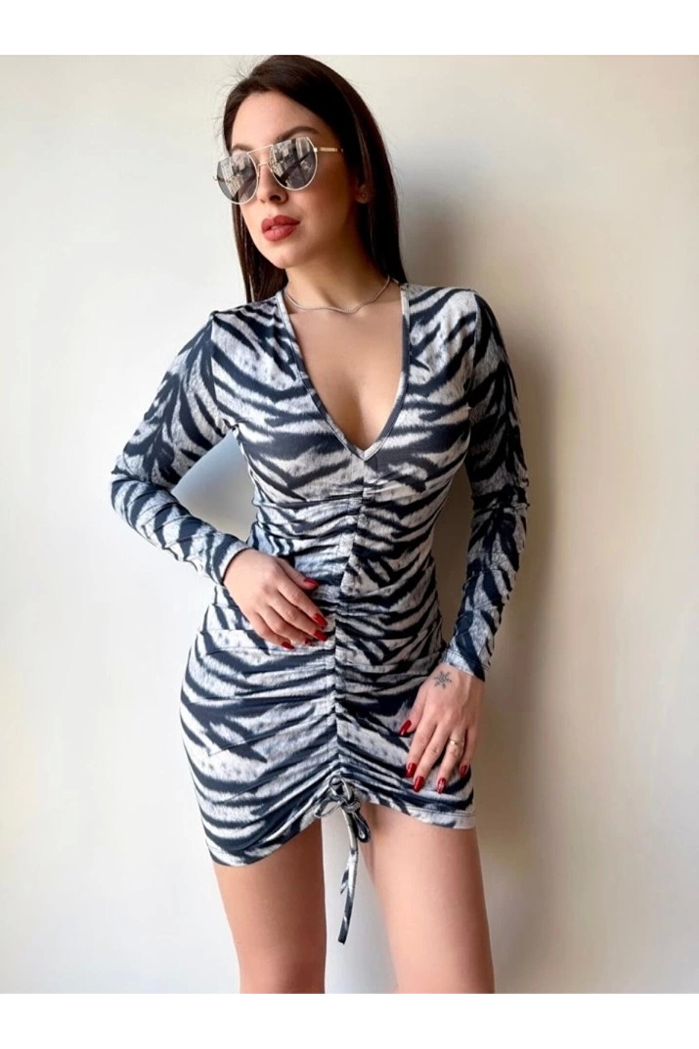 Kadın V Yaka önü Asansör Büzgü Detay Fırsat ürün Puantiyeli Mini Elbise Güzel günlerde kullanmanız dileğiyle