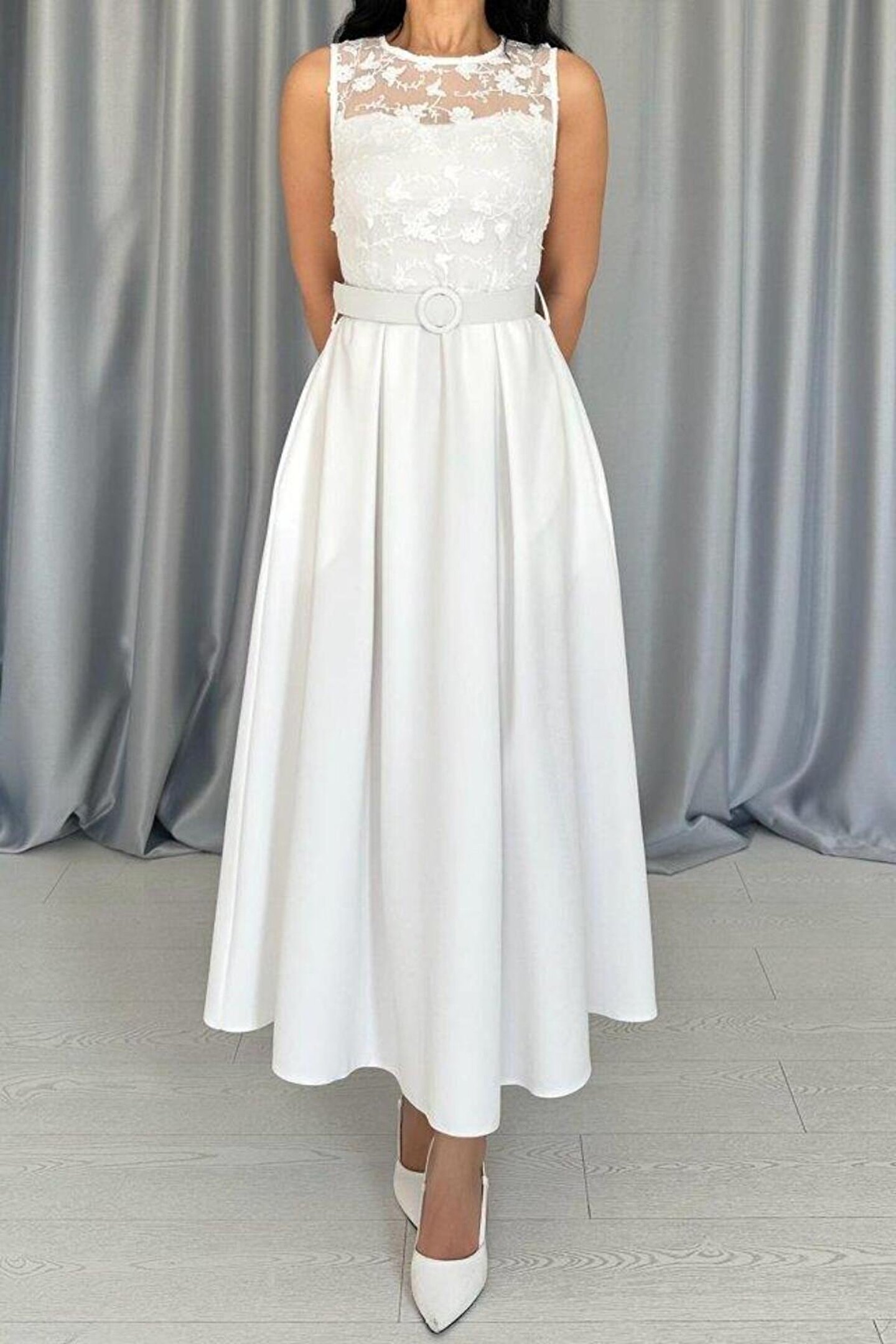 SGM BUTİK Beyaz Önü Dantel Detaylı Kemerli Elbise
