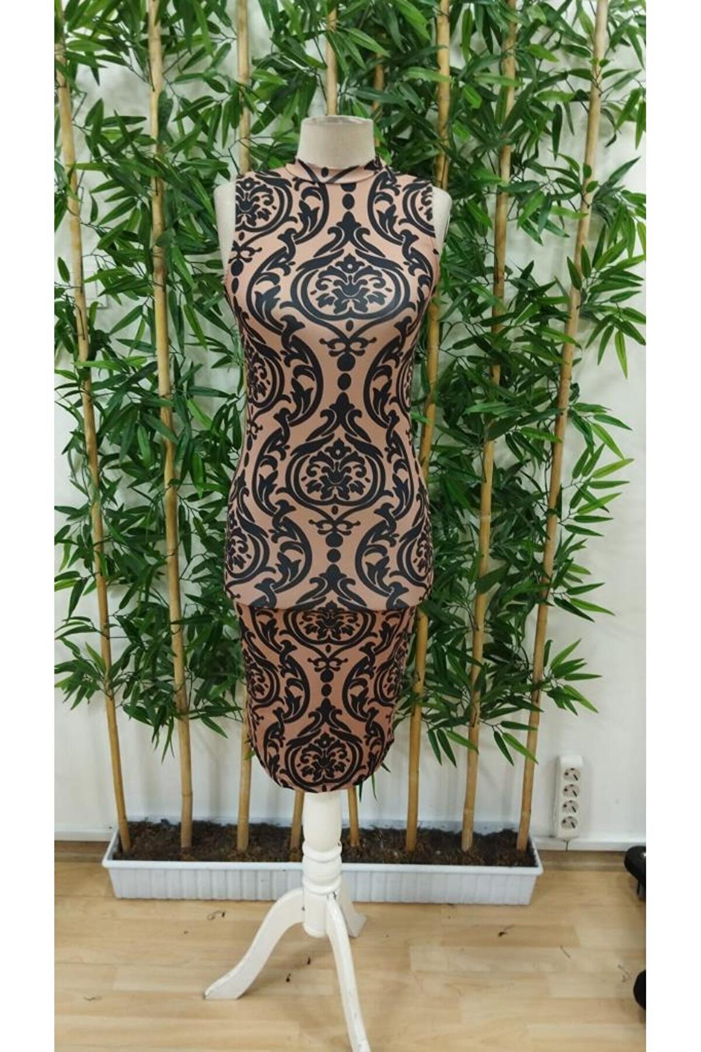 Kadın Kolsuz Yarı Balıkçı Yaka Desenli Dalgıç Elbise