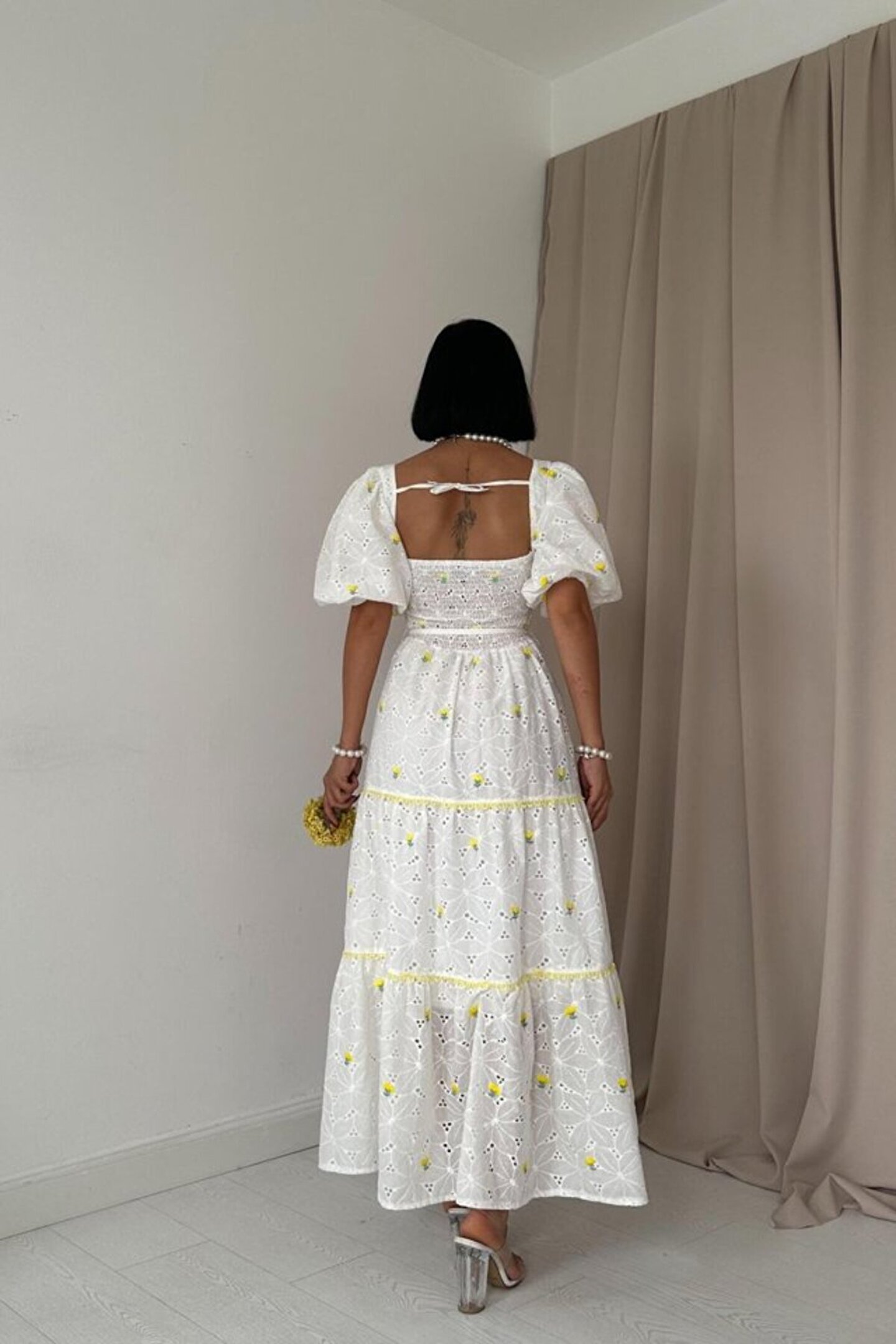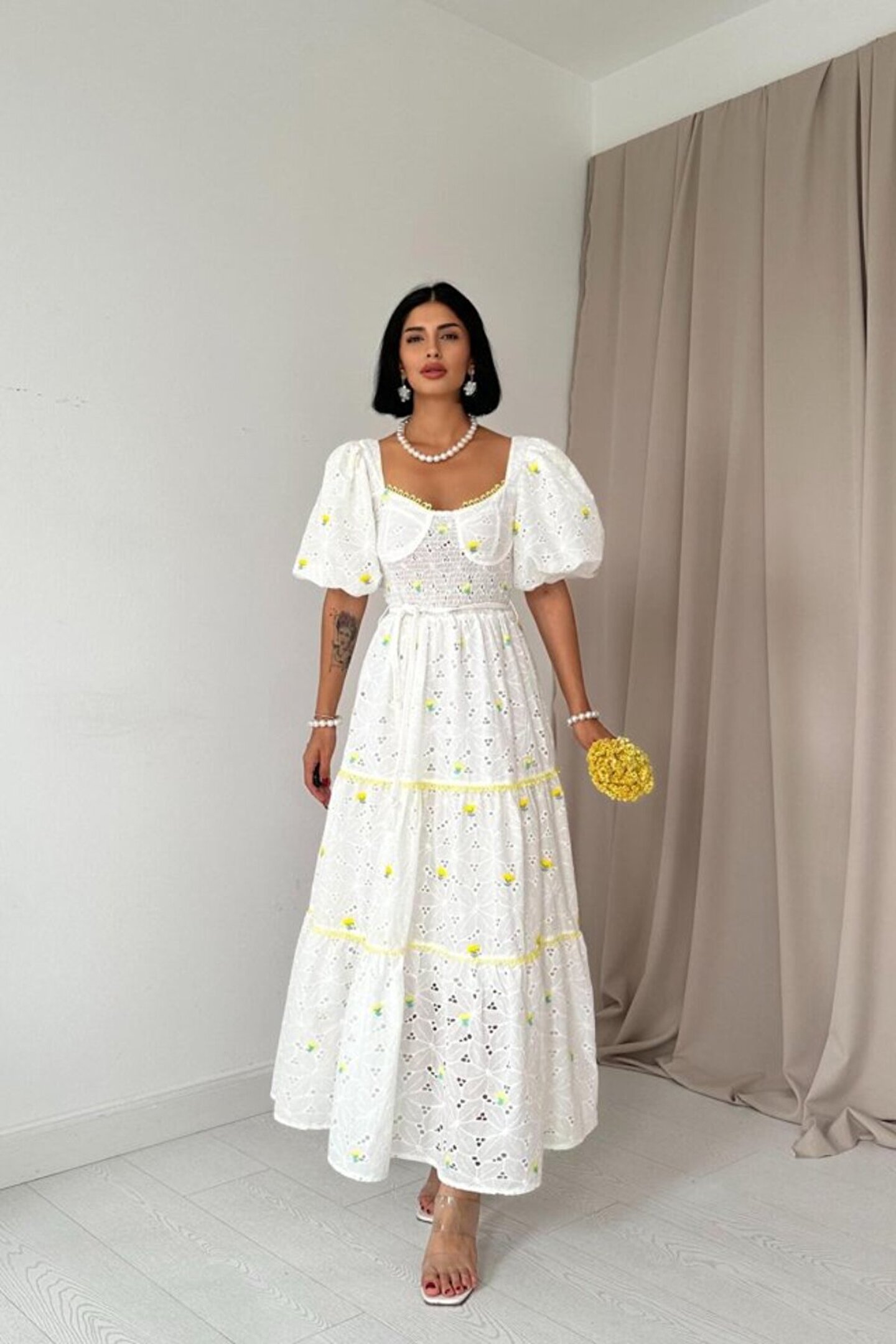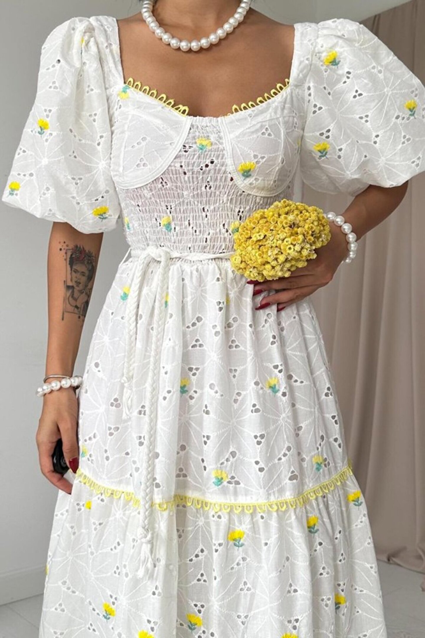 SGM BUTİK Sarı Dantel Detaylı Brode Elbise