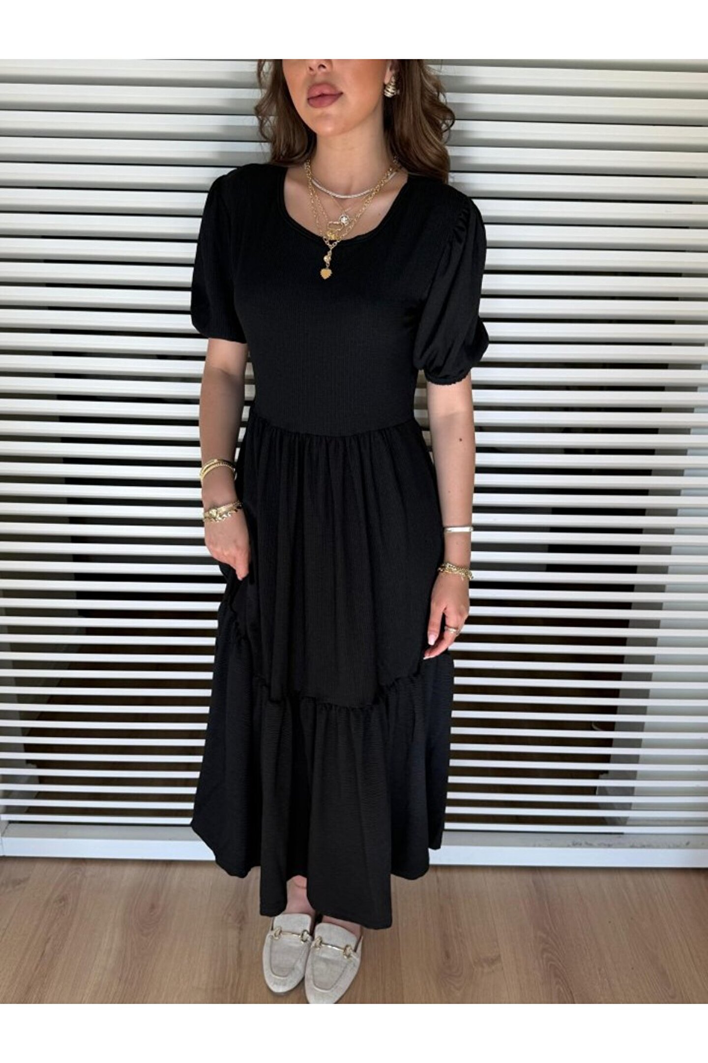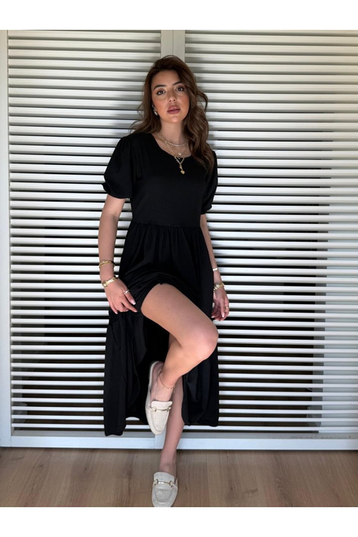 shopivastore EQURİ Kadın Kısa Kollu Yakası Açık Katlı Bürümcük Balon Elbise