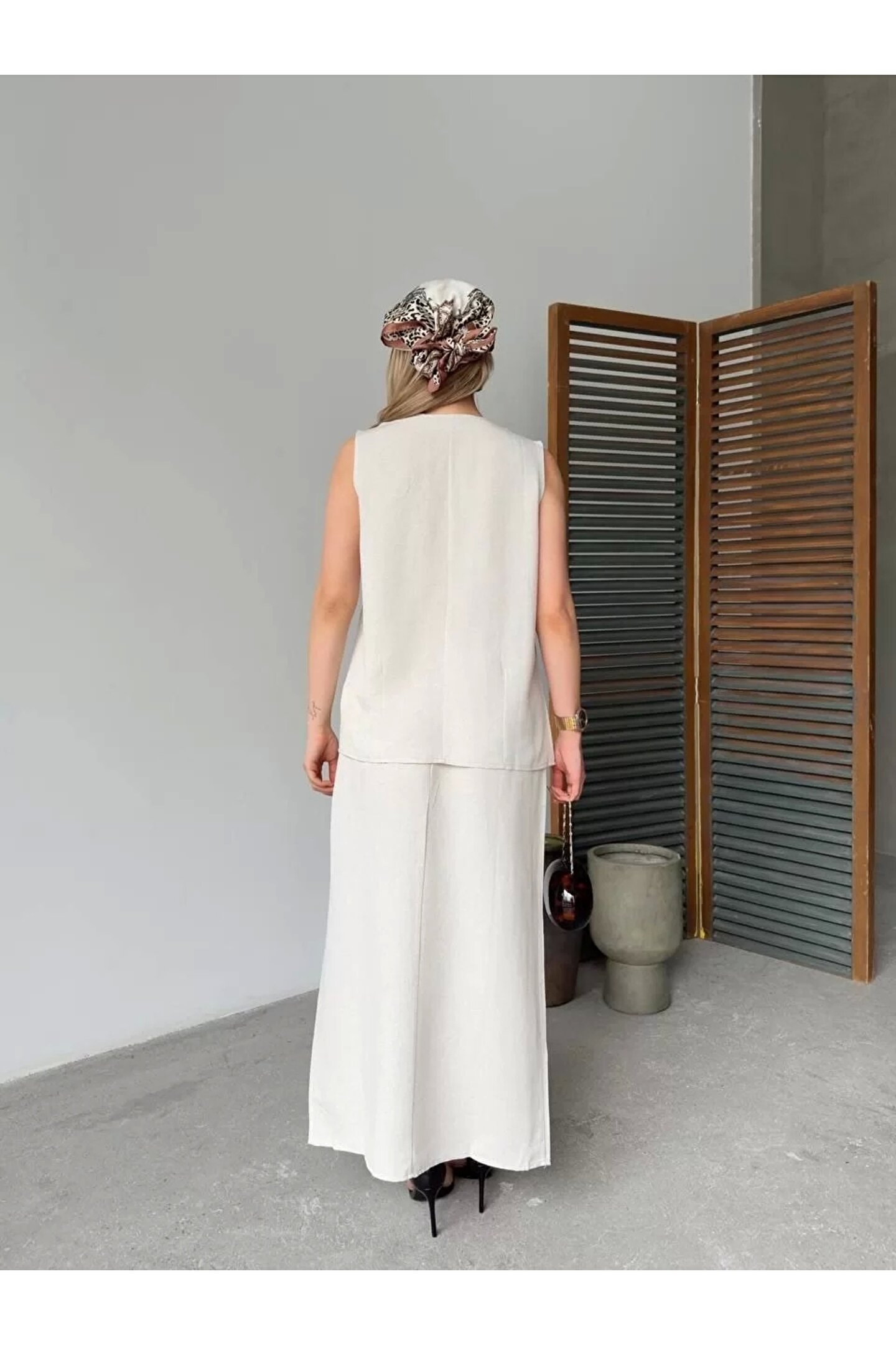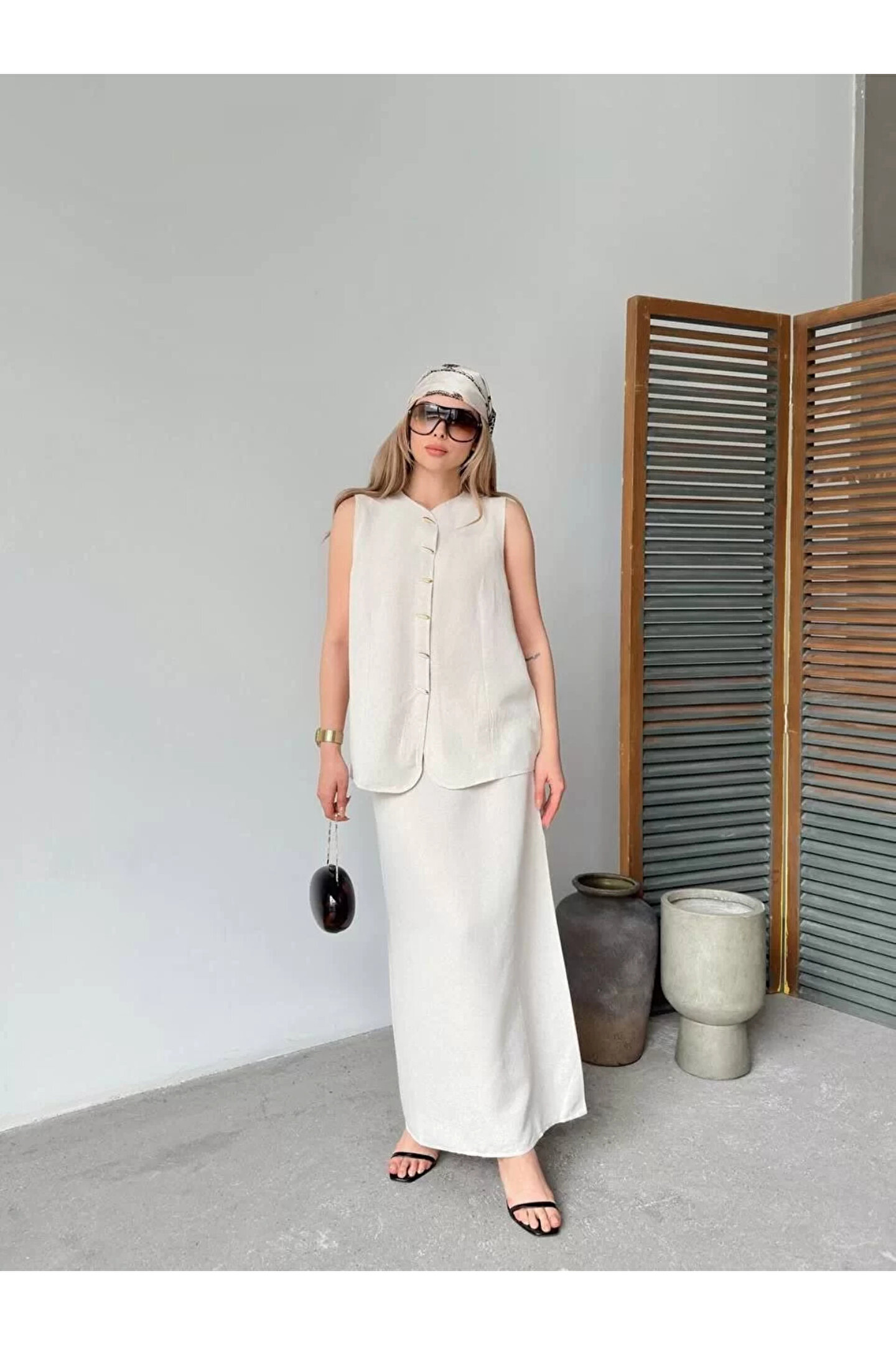 shopivastore Keten Kolsuz Sıfır Yaka İlik Düğmeli Kolsuz Hırka Etek ikili Takım- Beyaz