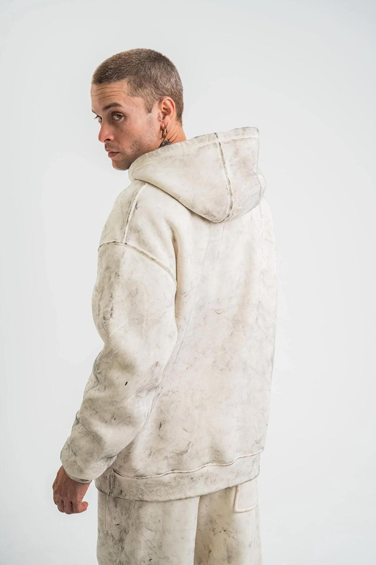 Unisex Double Oversize Kapşonlu Yıkamalı SweatShirt - Krem