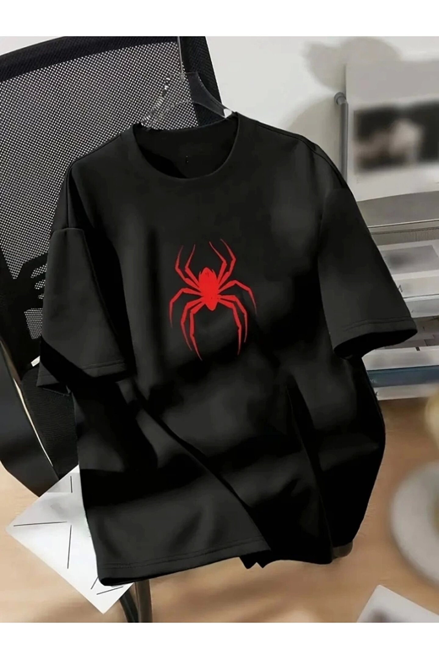 Baskılı Oversize Bisiklet Yaka T-shirt - Siyah