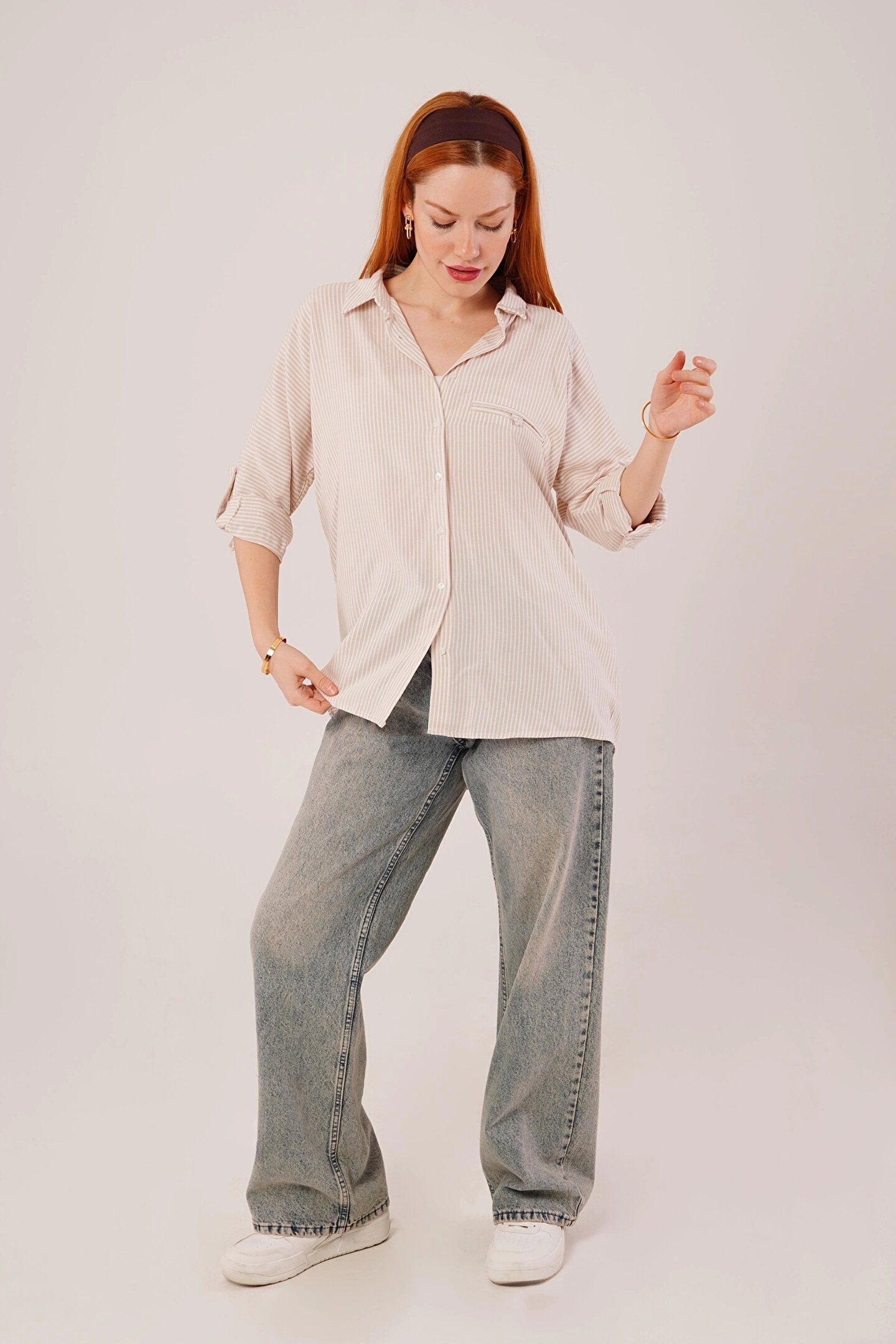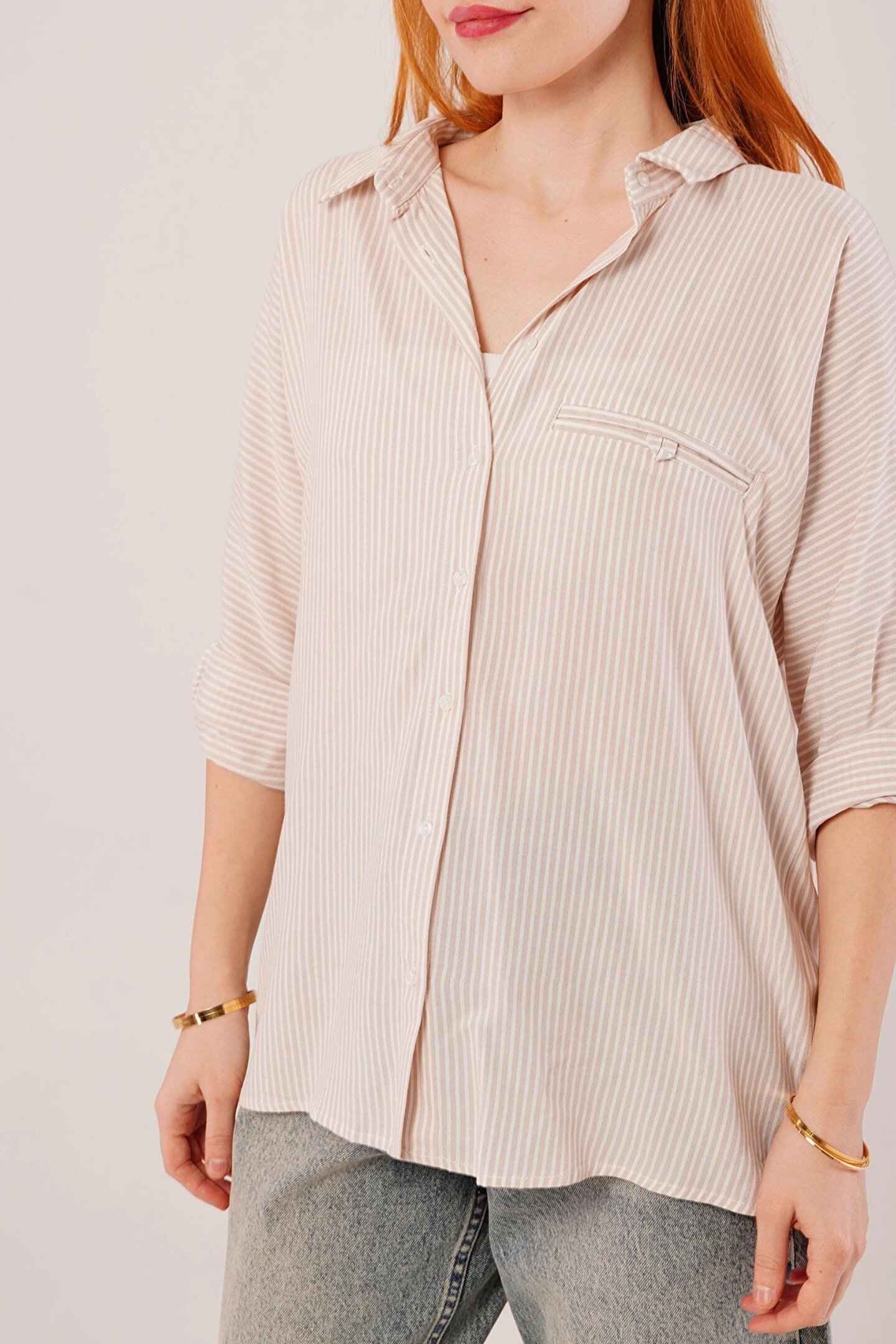 Cep Detay Çizgili Oversize Krem Gömlek