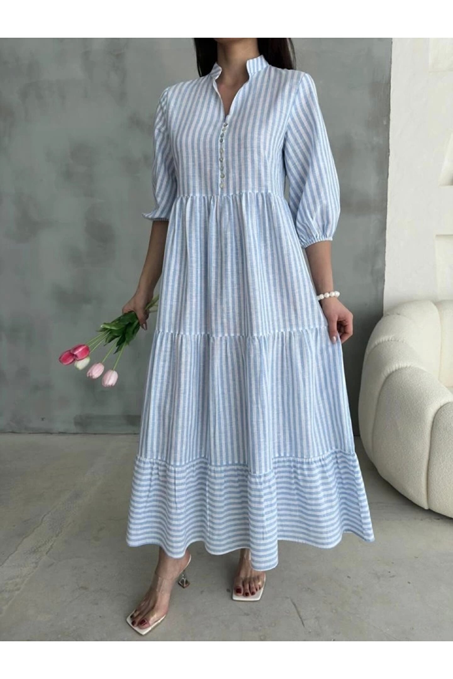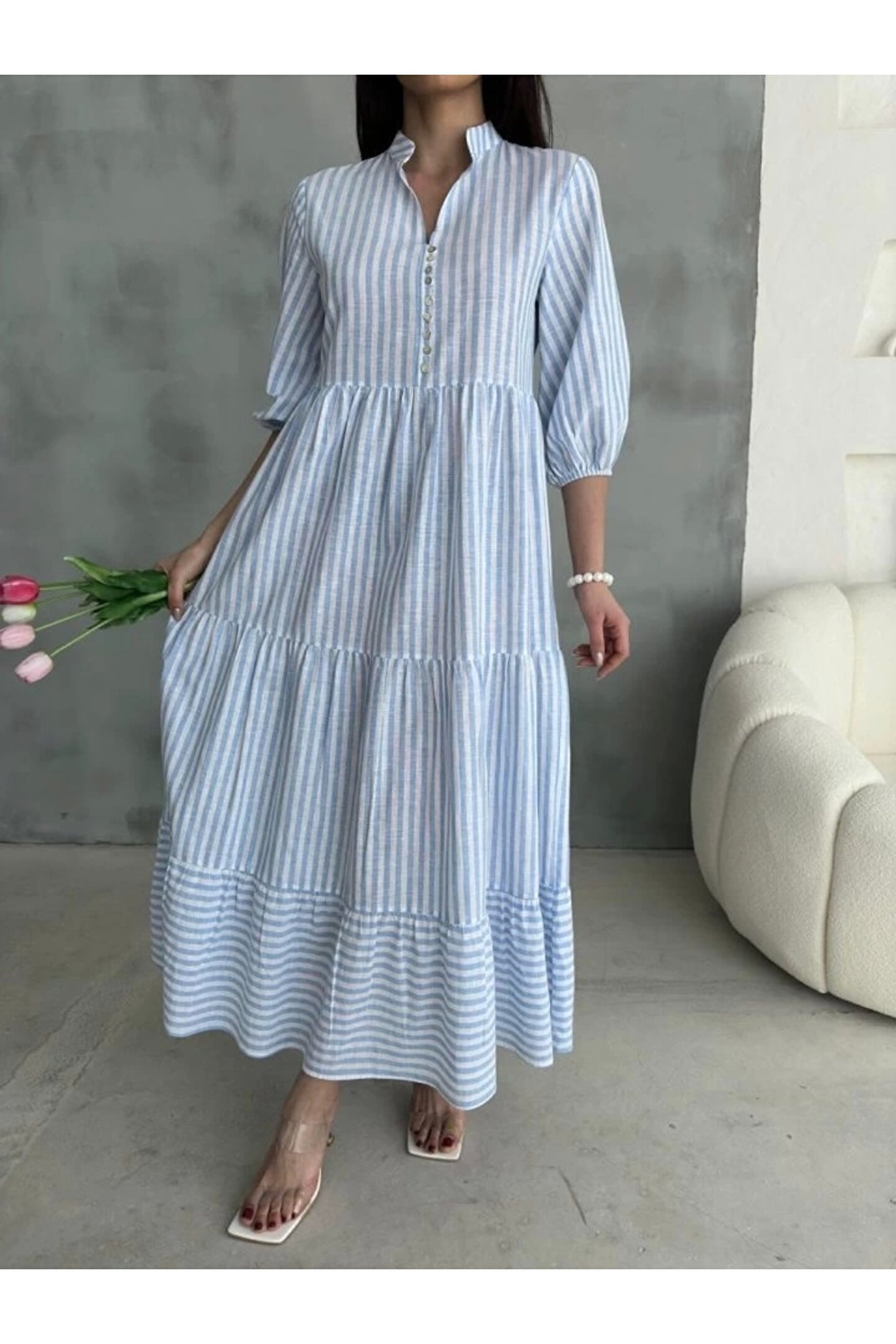 ÇİZGİLİ KETEN HAKİM YAKA DÜĞMELİ SALAŞ ELBİSE - Mavi