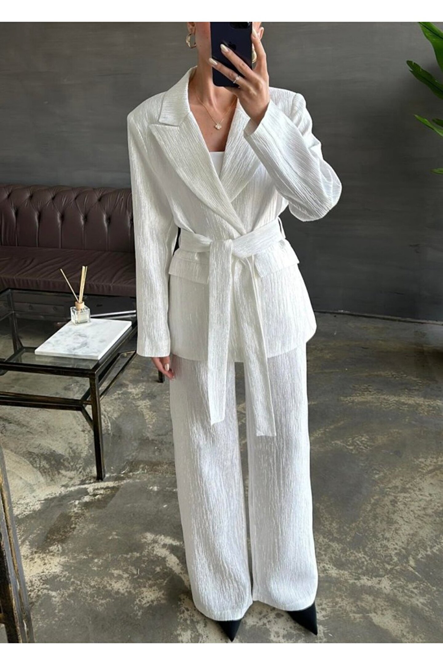 Silerra Ekru Beli Kuşaklı Ceket Ve Pantolon Parlak Takım