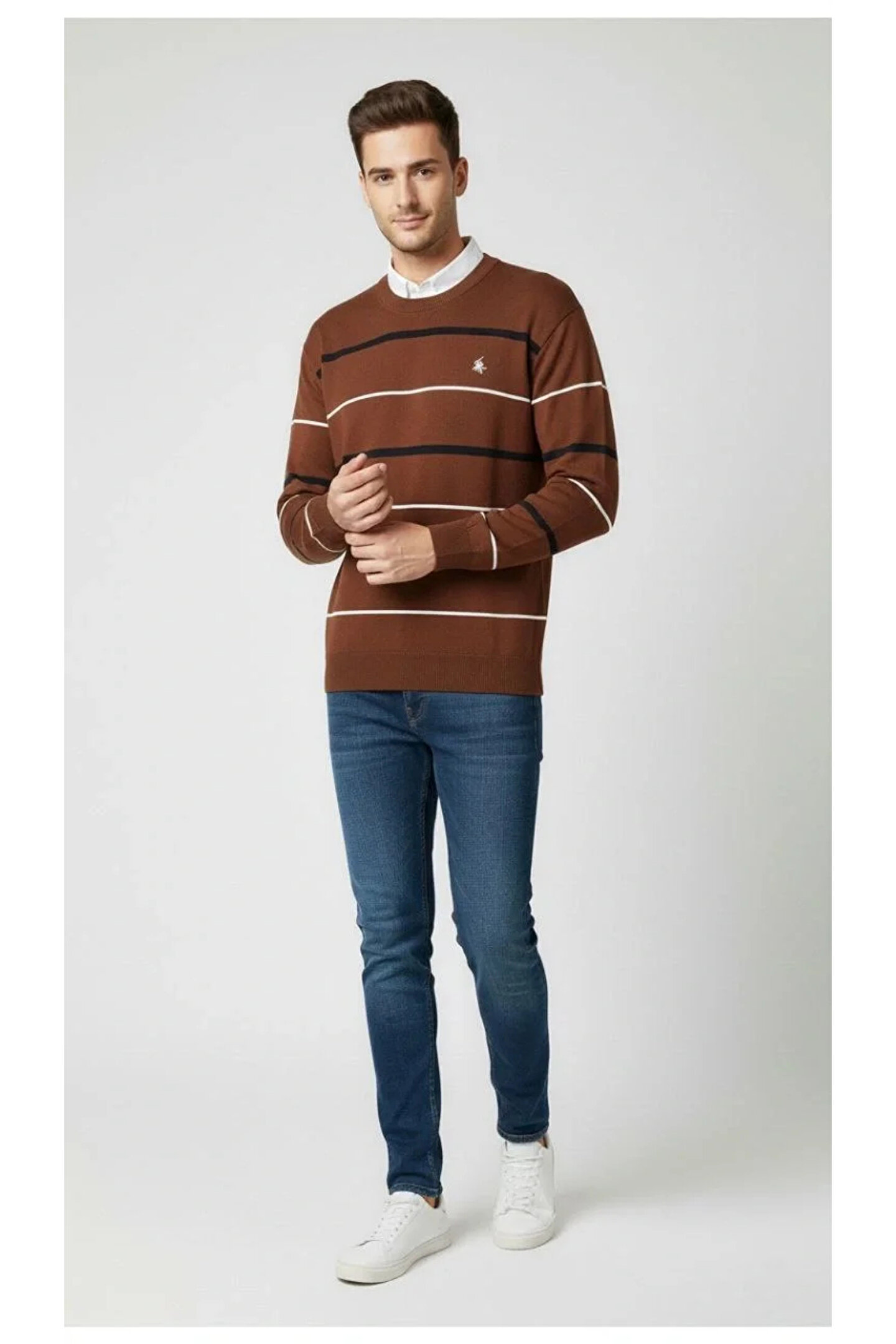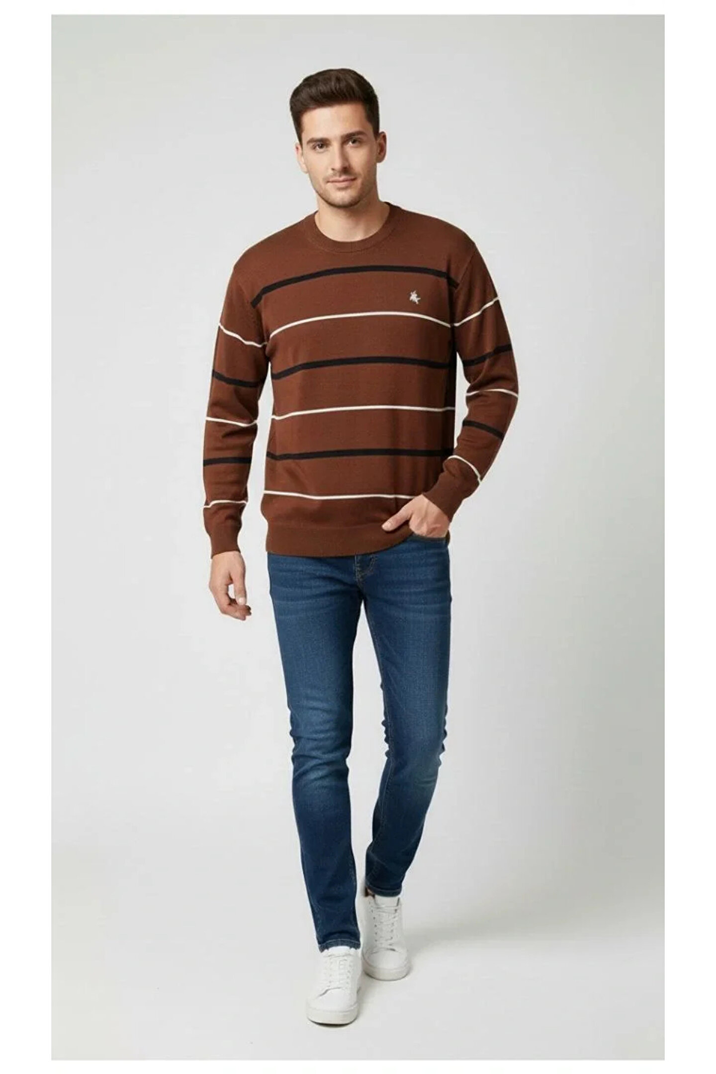 Silerra Erkek Bisiklet Yaka Cizgili Triko Kazak yumuşak dokulu Pamuklu ince Dokuma, uzun kollu Rahat Regular