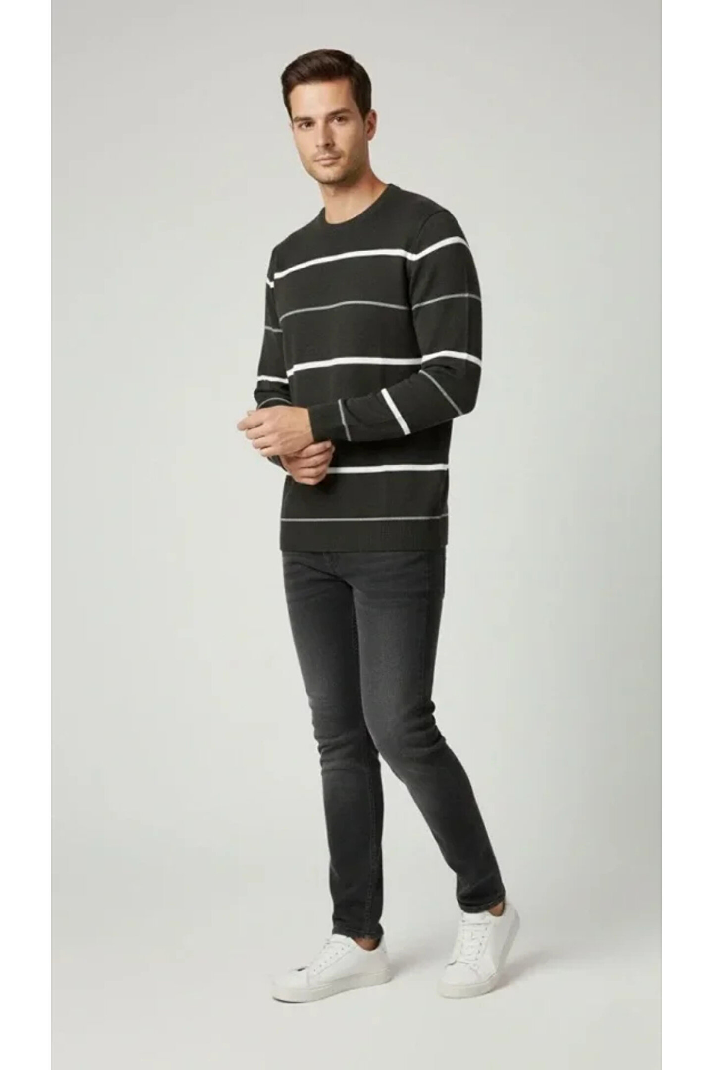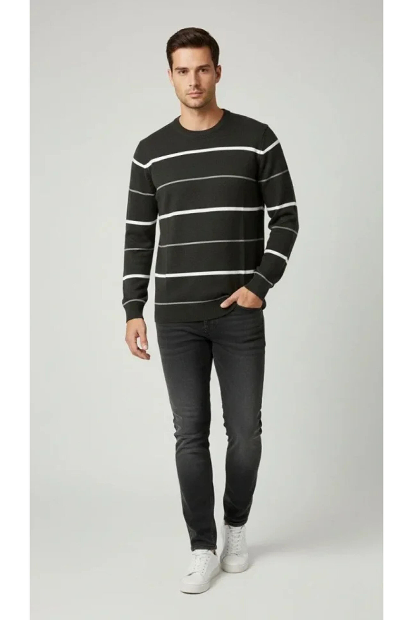 Erkek Bisiklet Yaka Cizgili Triko Kazak Yumuşak Dokulu Pamuklu Ince Dokuma, Uzun Kollu Rahat Regular Kalıp - Füme