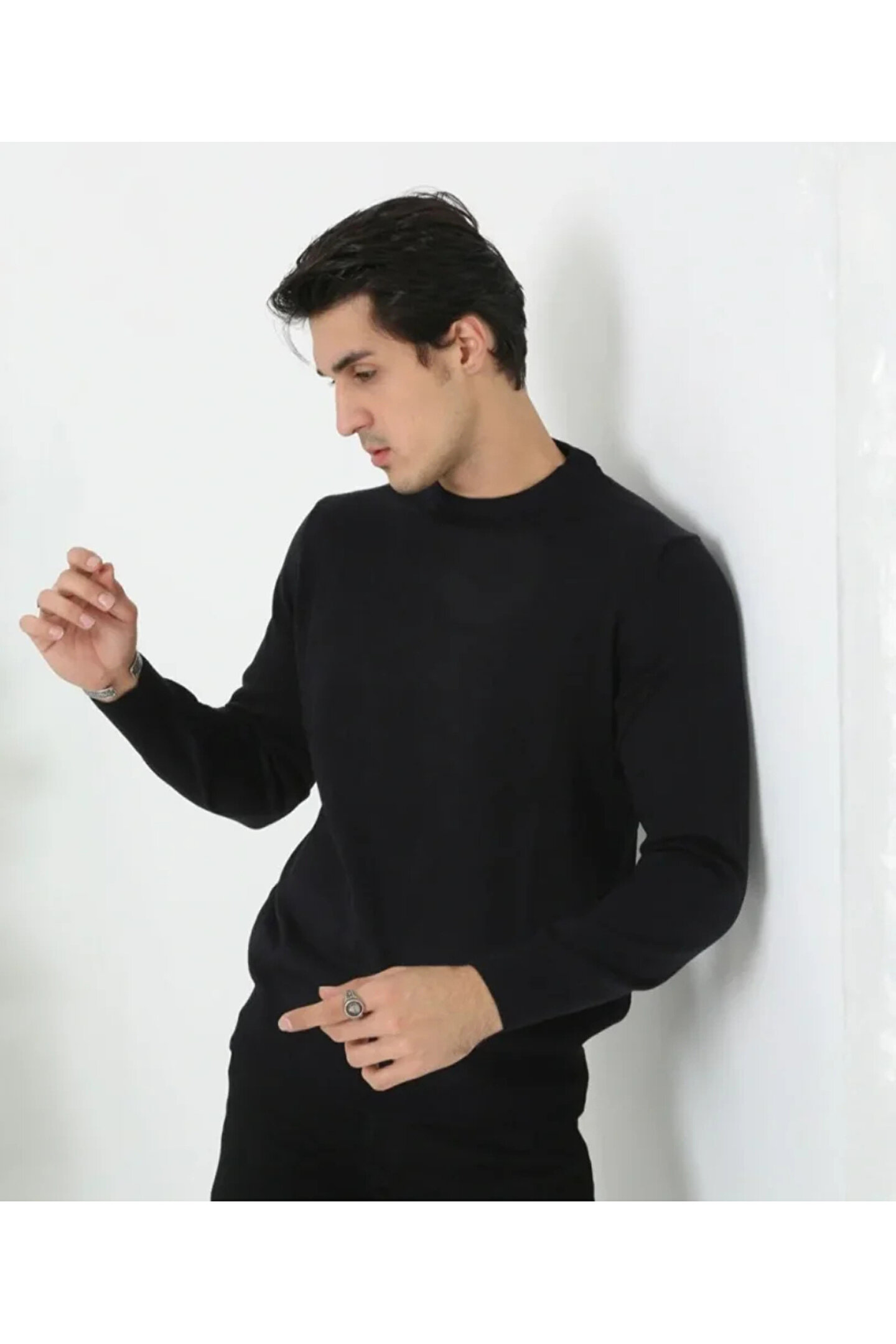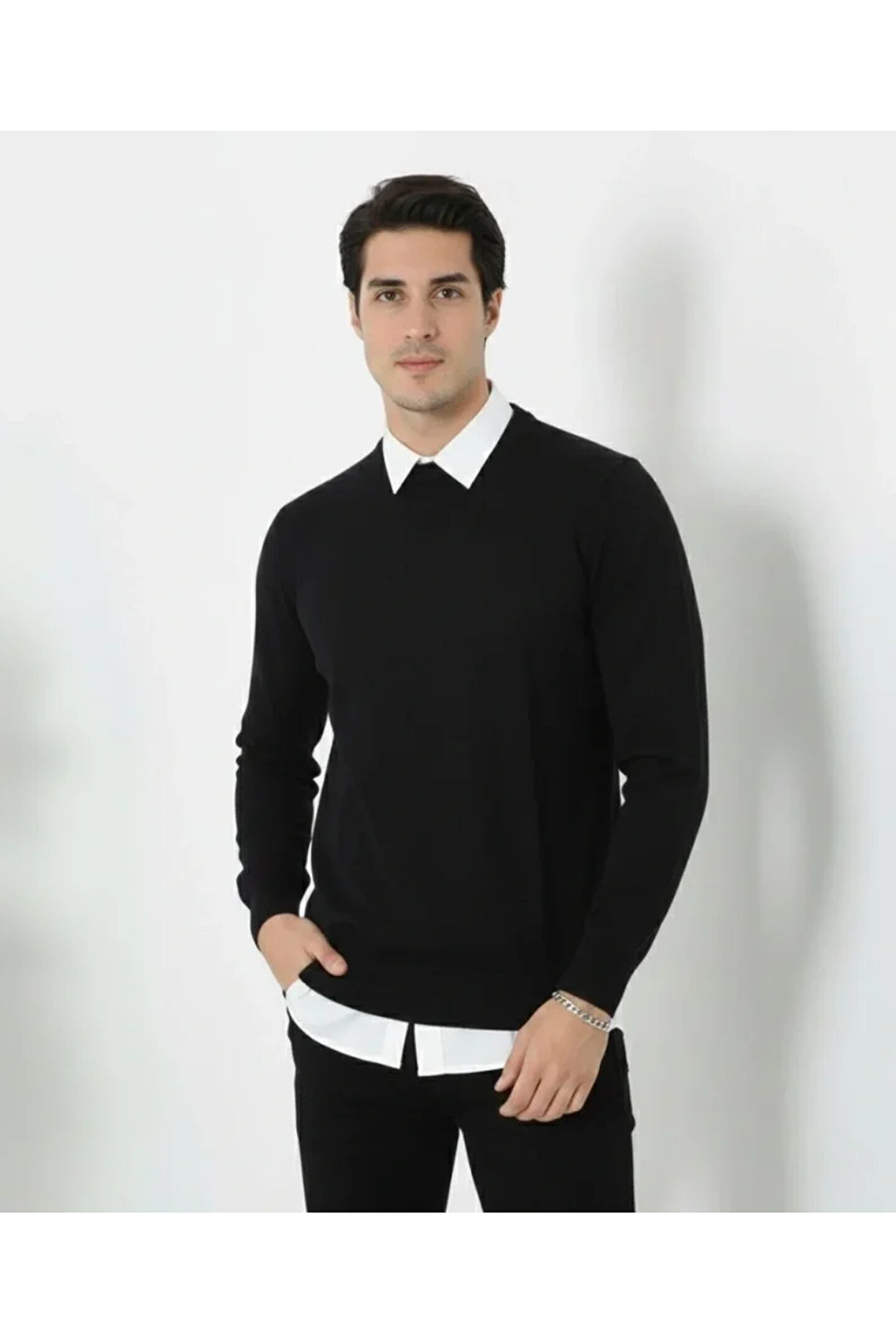 Erkek Bisiklet Yaka Triko Kazak Yumuşak Dokulu Pamuklu Ince Dokuma, Uzun Kollu Rahat Regular Kalıp - Siyah