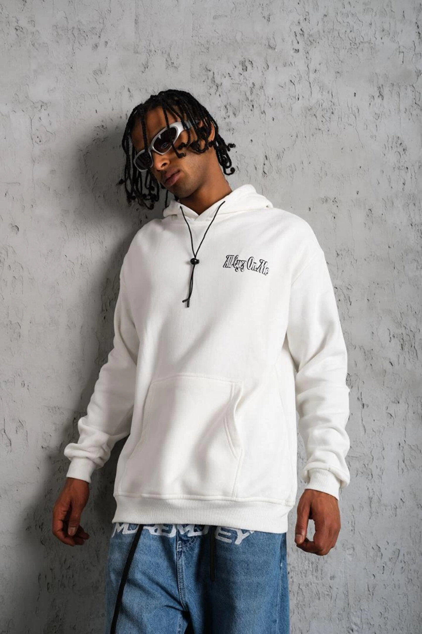 Silerra Erkek Kol ve Etek Ribana Baskılı Kapüşonlu Sweat - Beyaz