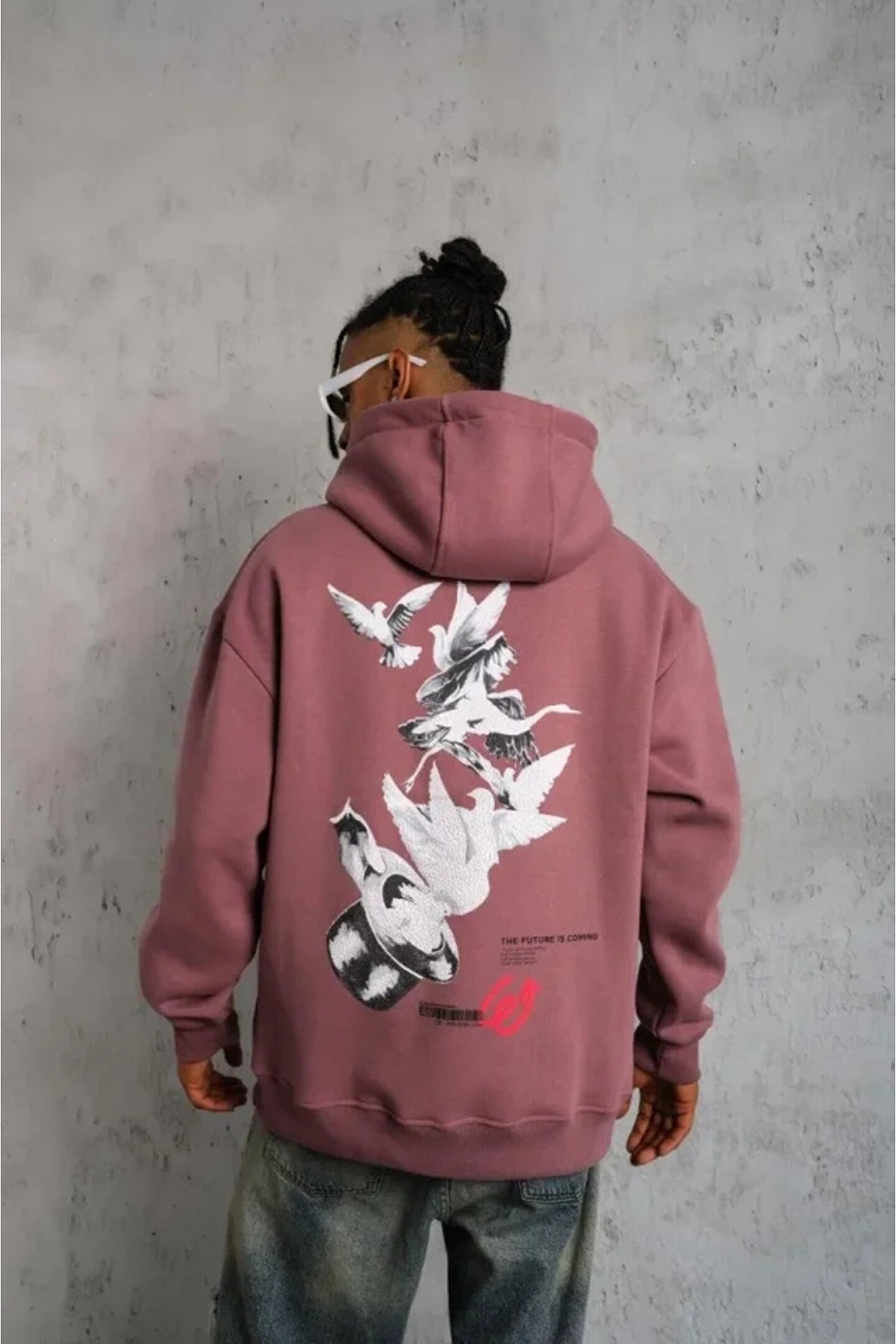 Erkek Şapkalı Güvercin Baskılı Kapşonlu Sweat - Gül Kurusu