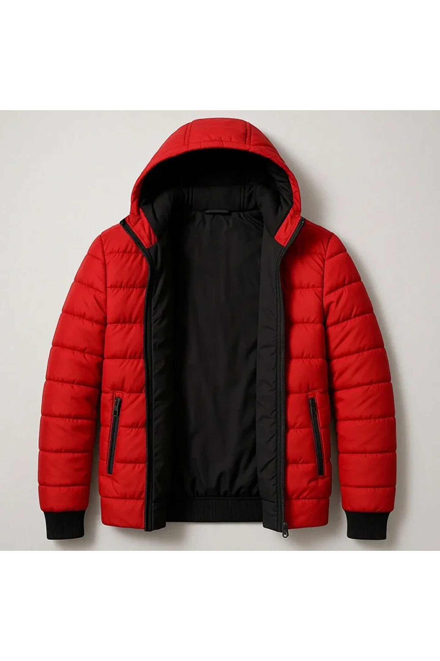 Erkek Şişme Kapüşonlu Fermuarlı Mont Su Itici Kapitone Astarlı Kumaş Cepli Kışlık Rahat Kalıp - Kırmızı