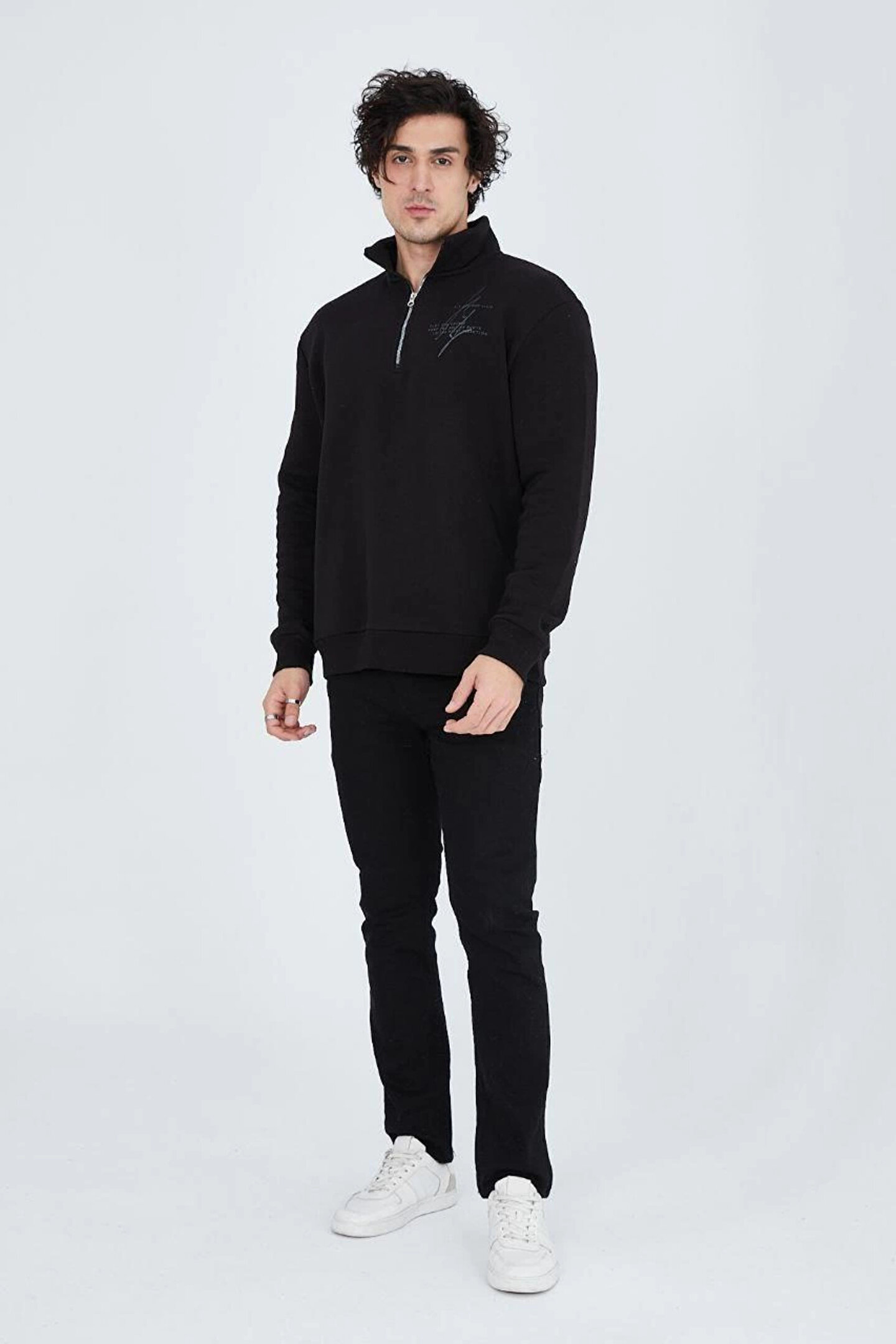 - Siyah renkli tasarımıyla her ortama uyum sağlayan, çok renkli baskı detaylarıyla şıklığı ön plana çıkaran erkek yarım fermuarlı sweat.; - Rahat ve özgür hareket imkanı sunan relaxed kalıp ile günlük kullanım için ideal bir tercih.; - Örme kumaş yapısı sayesinde konforlu bir deneyim sunar ve uzun süreli kullanımlarda bile formunu korur.; - Türkiye'de üretilmiş olup, yerel üretim kalitesini ve dayanıklılığını yansıtır.; - Fermuarlı yaka tasarımı, kolay giyilip çıkarılmasını sağlar ve farklı kombinler için esneklik sunar.; - Uzun kol boyu ile mevsim geçişlerinde ideal koruma sağlar ve şık bir görünüm kazandırır.; - Yetişkin erkekler için özel olarak tasarlanmıştır; hem spor hem de günlük giyimde rahatlıkla tercih edilebilir.; - Cepsiz tasarımı ile minimalist bir stil sunarken, uzun boyu modern ve şık bir siluet oluşturur.; - S bedeniyle vücut hatlarınıza mükemmel uyum sağlayarak rahat bir kullanım sunar.