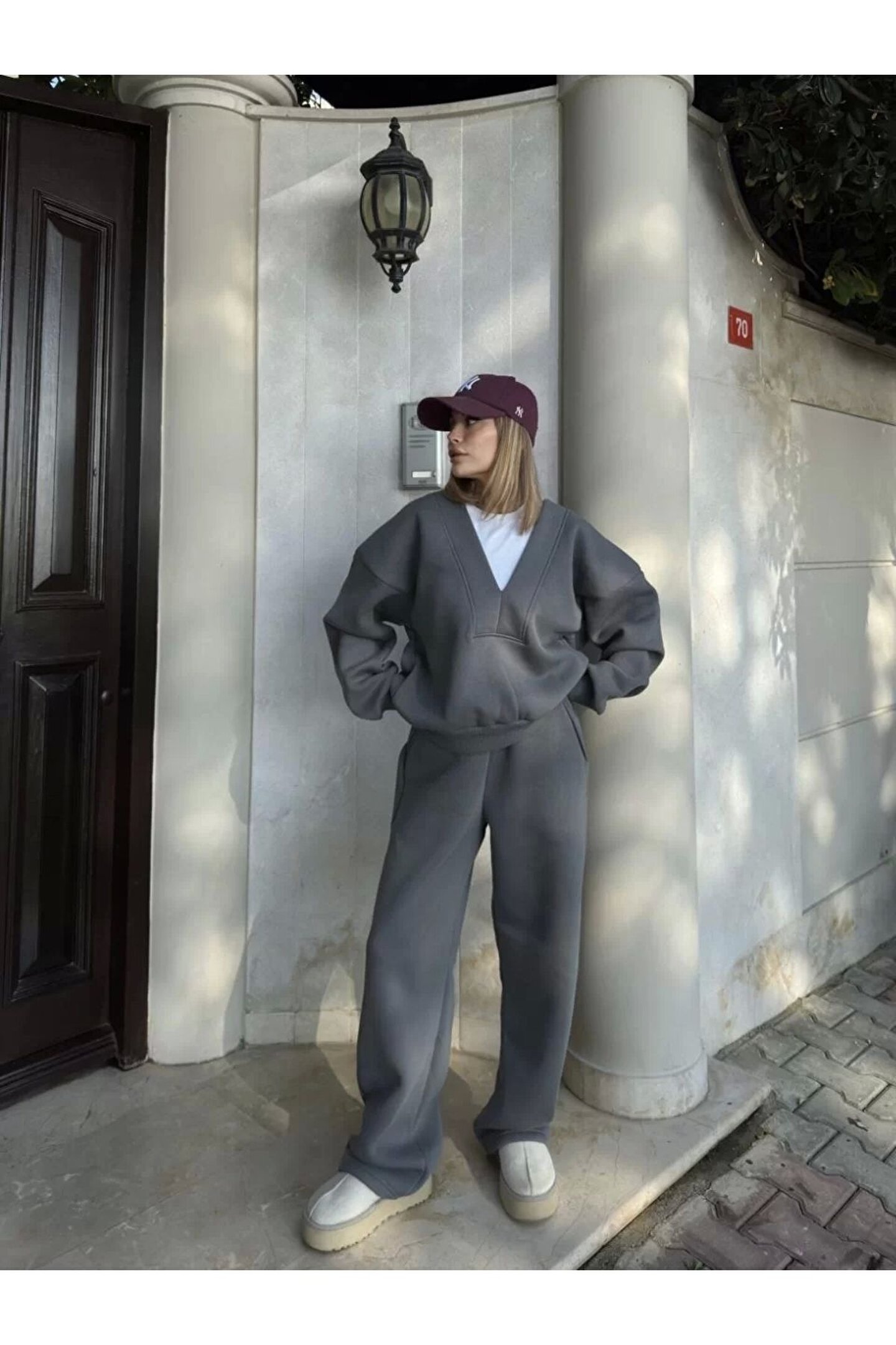 Geniş V Yaka Üç İplik Sweat Takım - Füme