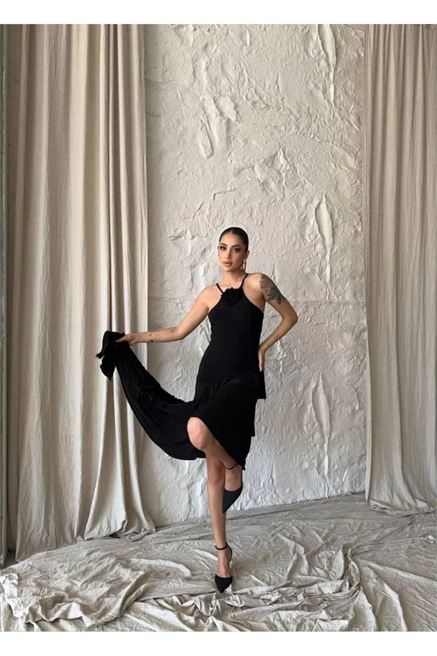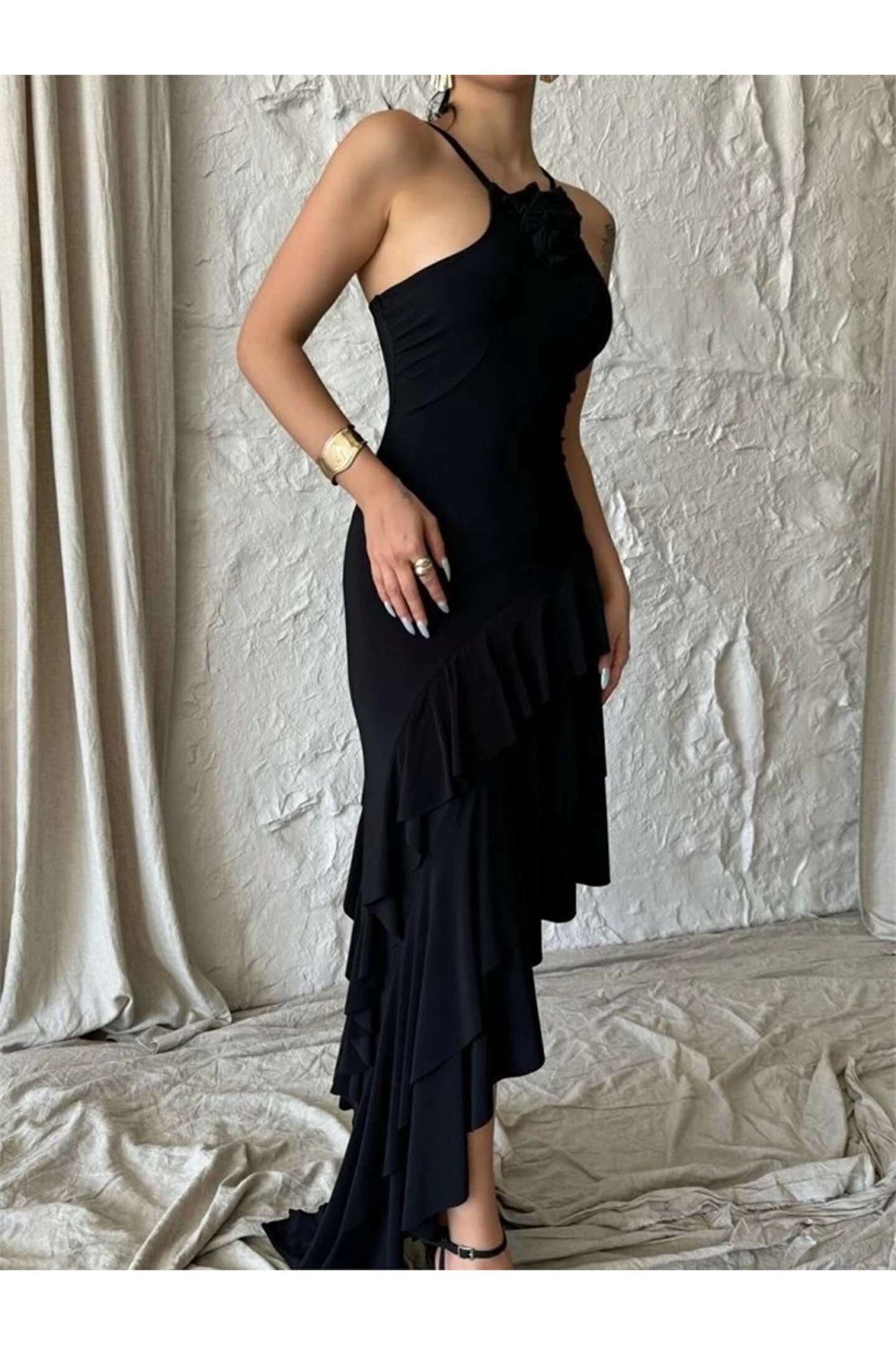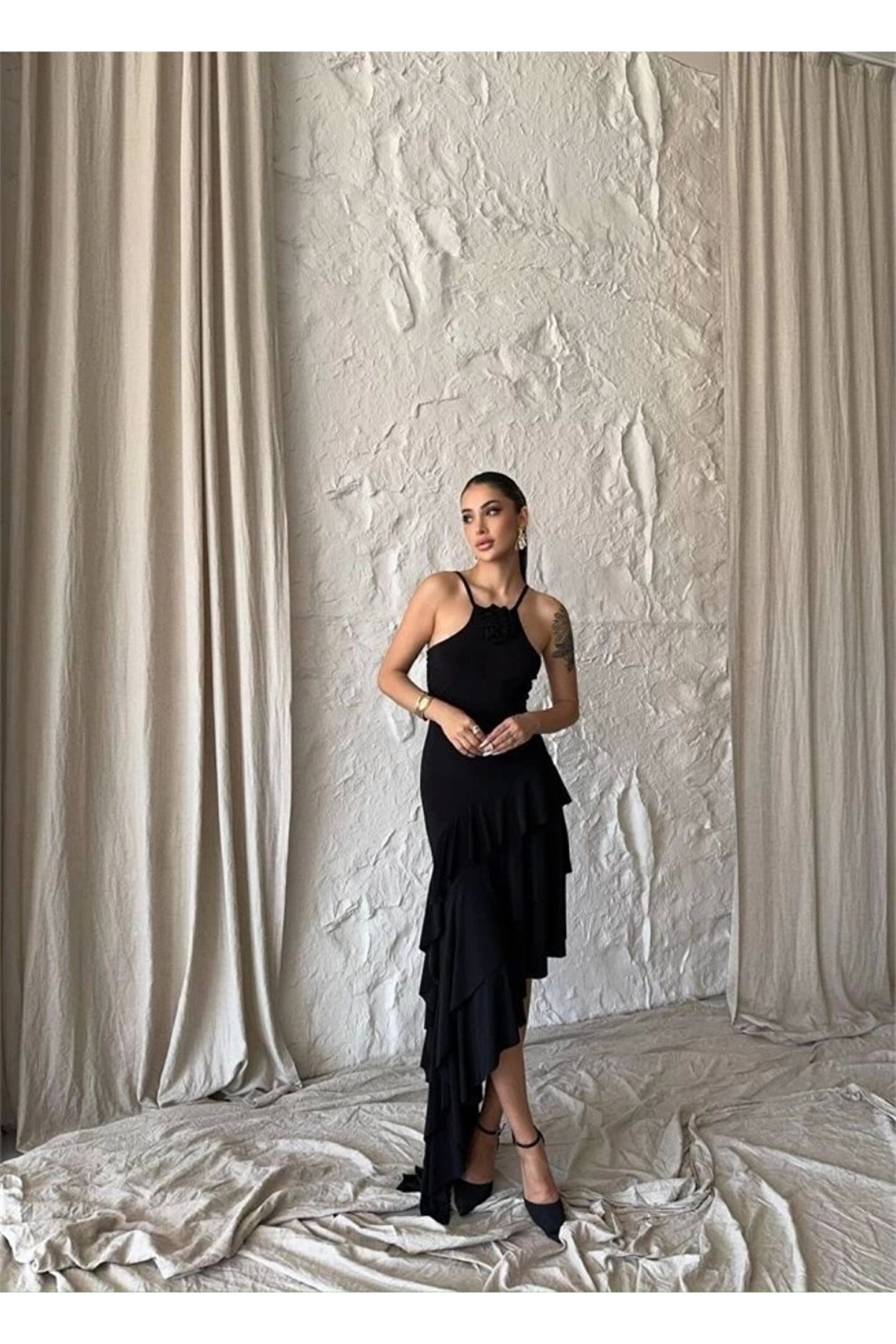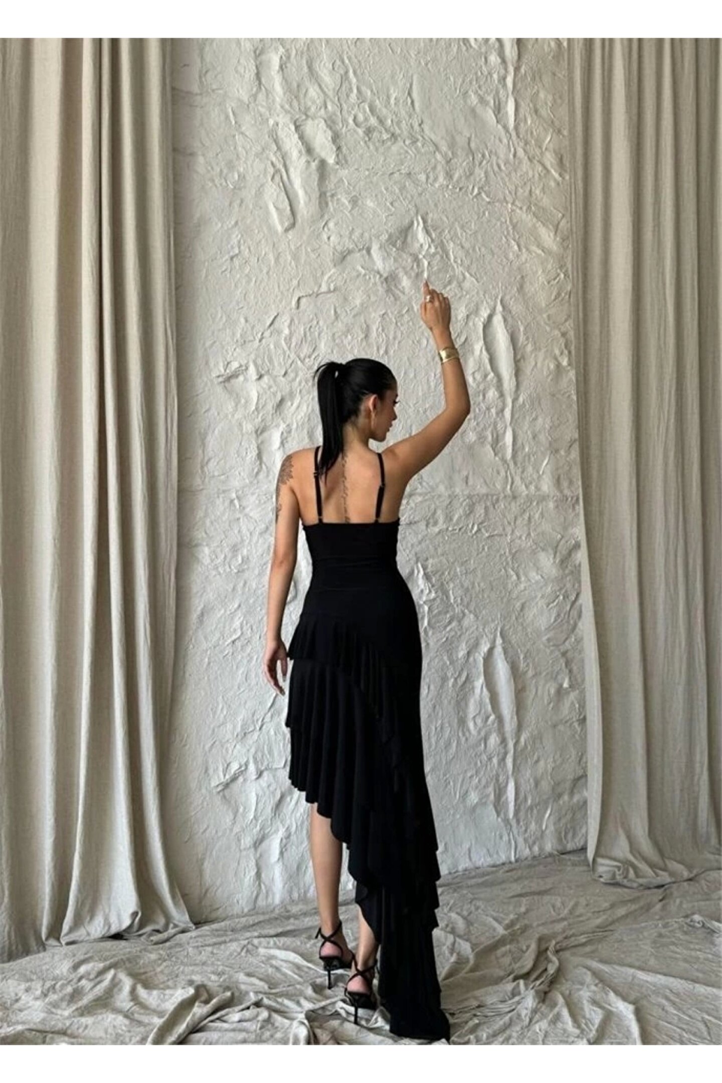 GÜLLÜ ELBİSE ASİMETRİK KATLI - Siyah