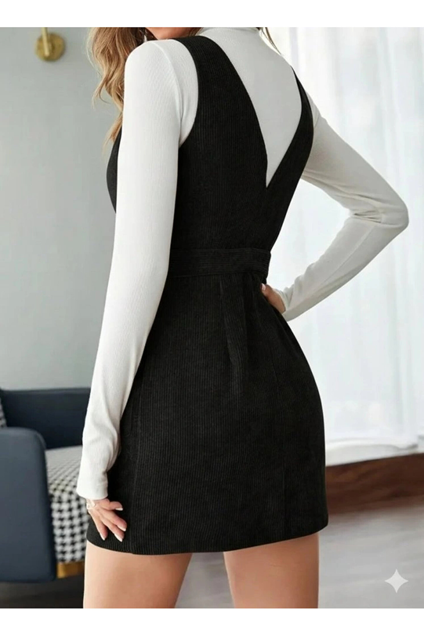 Silerra Kadın Askılı V Yakalı önden Düğmeli Mini Kalın Fitilli Kadife Elbise
