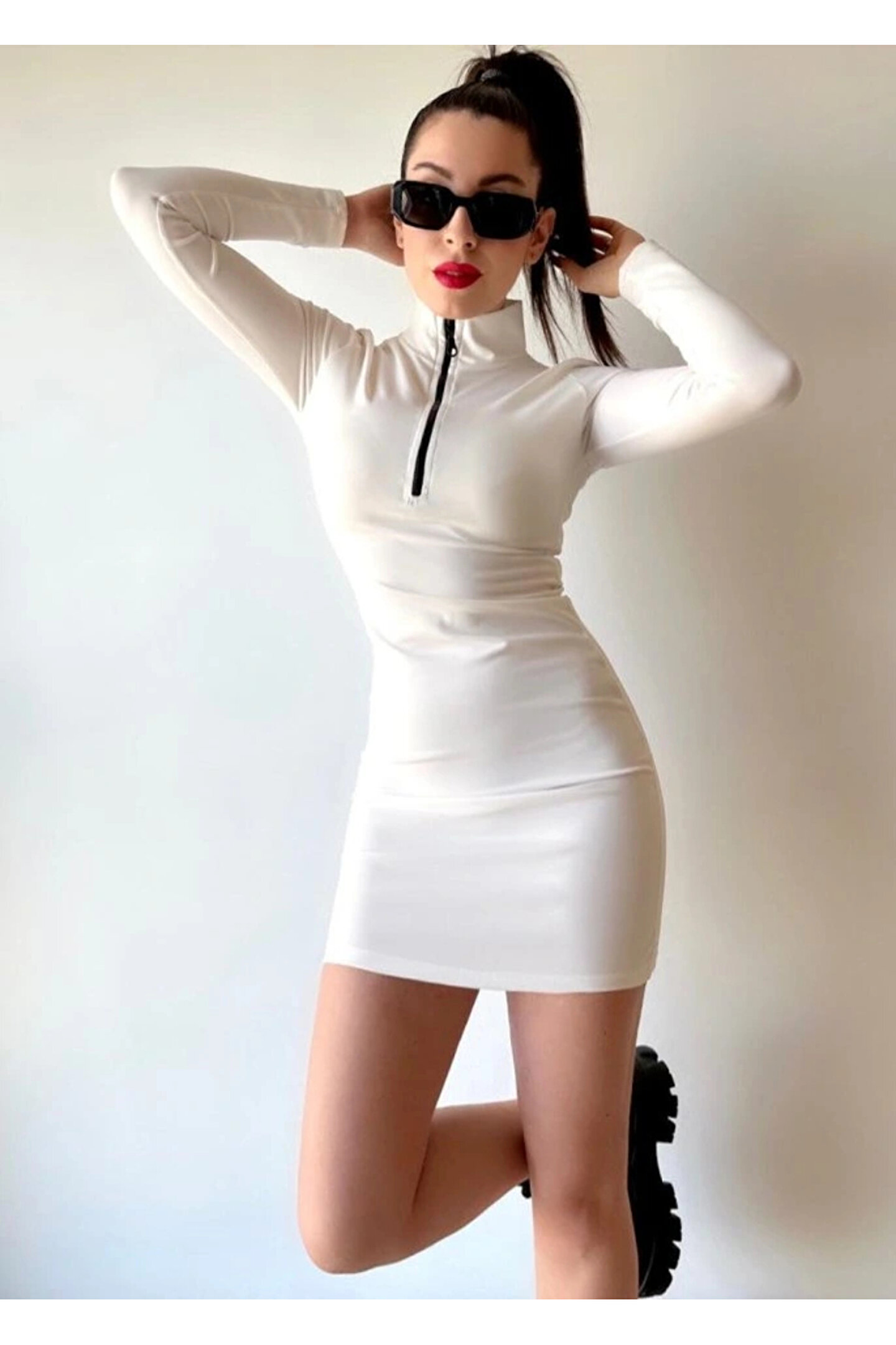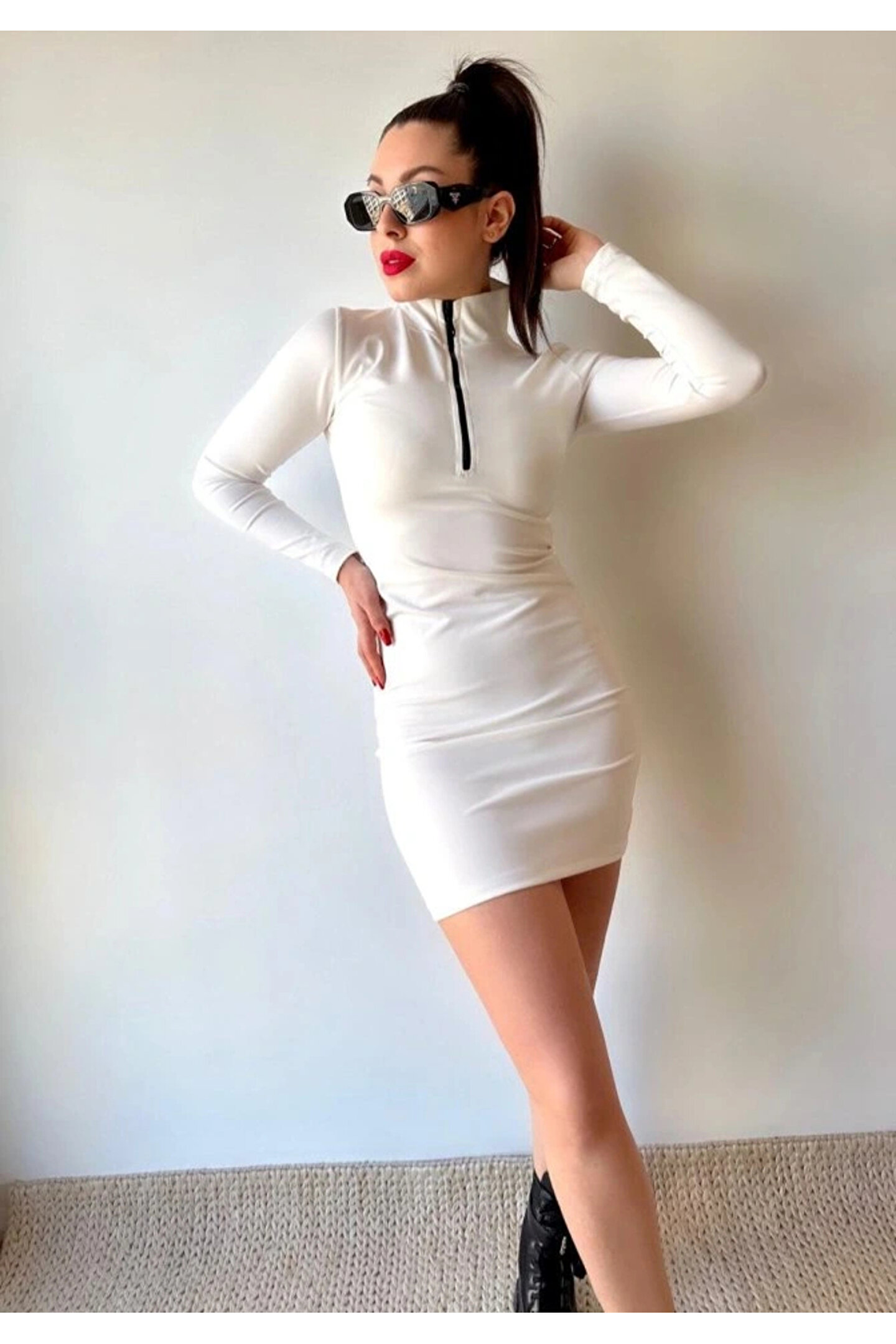 Kadın Balıkçı Yaka Fermuar Detay Mini Elbise