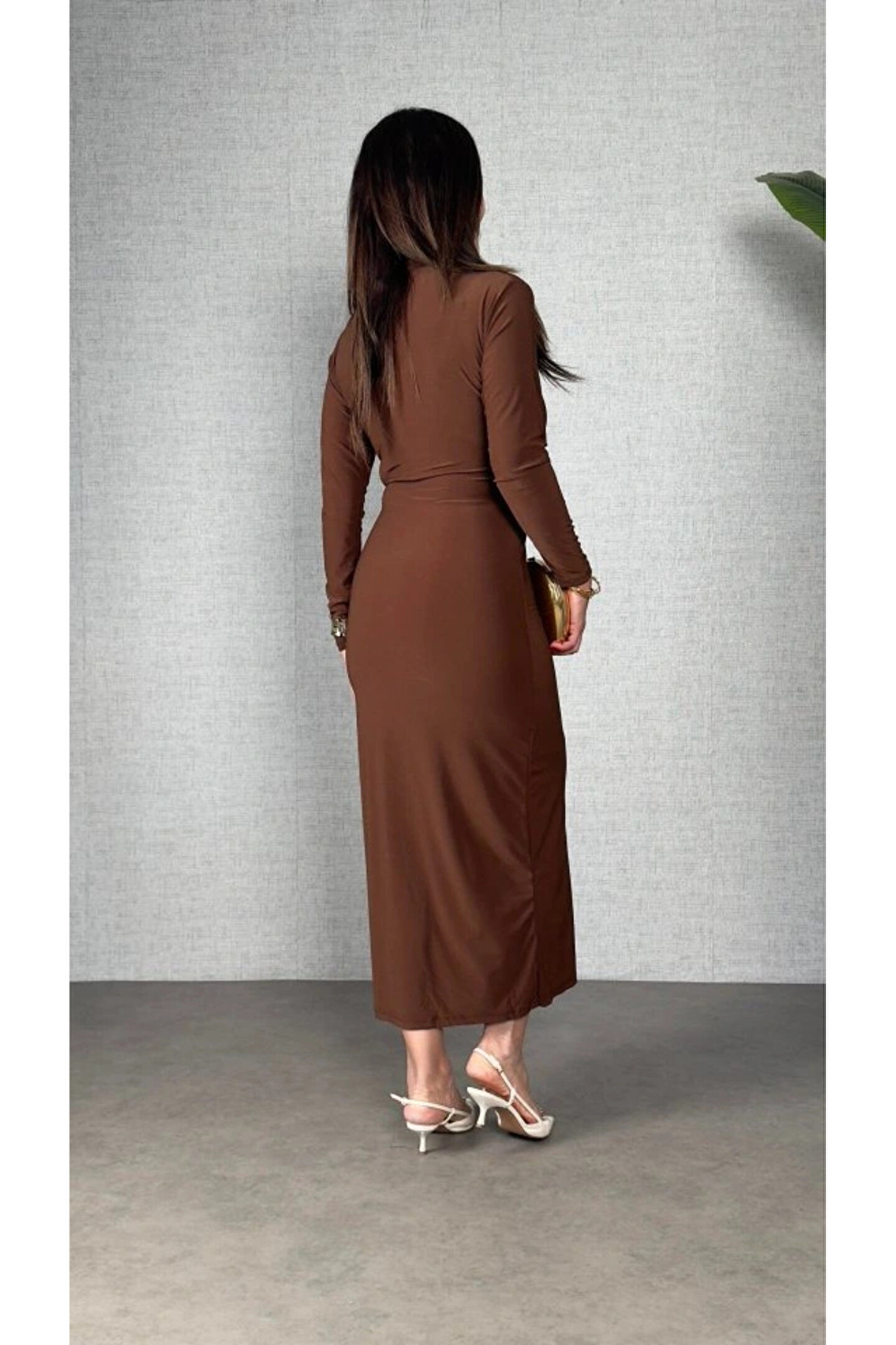 Kadın Balıkçı Yaka Toka Detay Sandy Kumaş Midi Boy Elbise