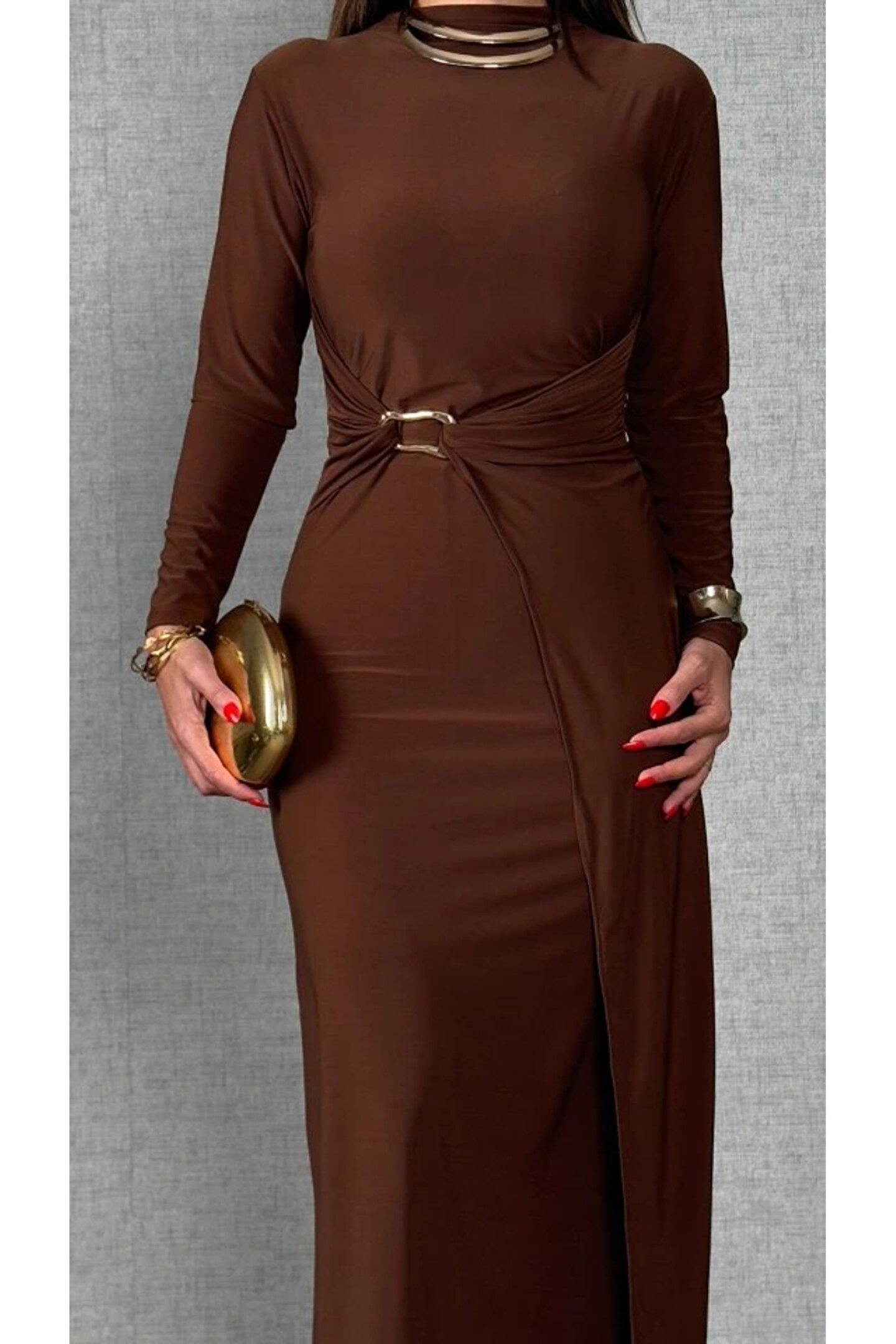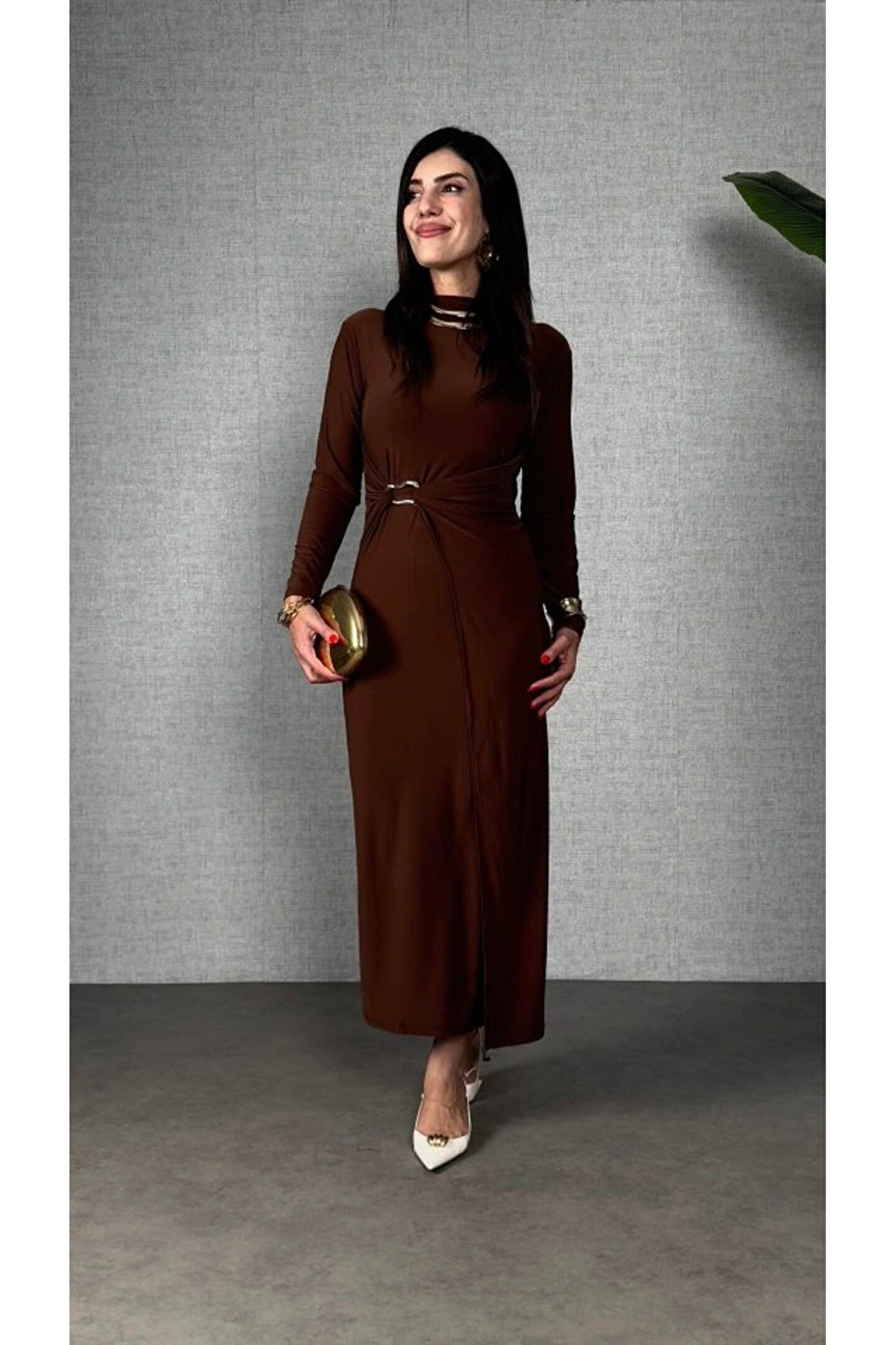 Silerra Kadın Balıkçı Yaka Toka Detay Sandy Kumaş Midi Boy Elbise