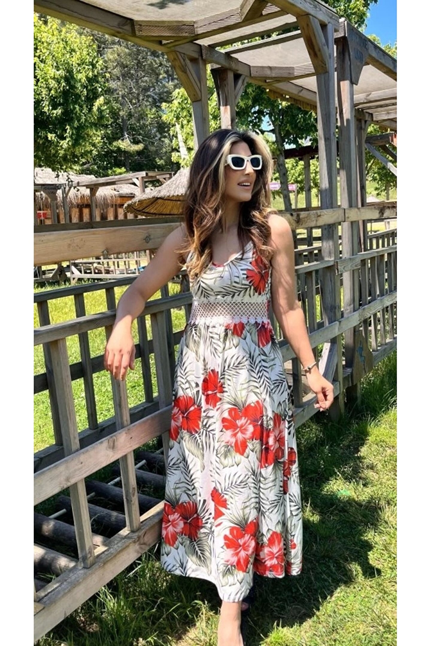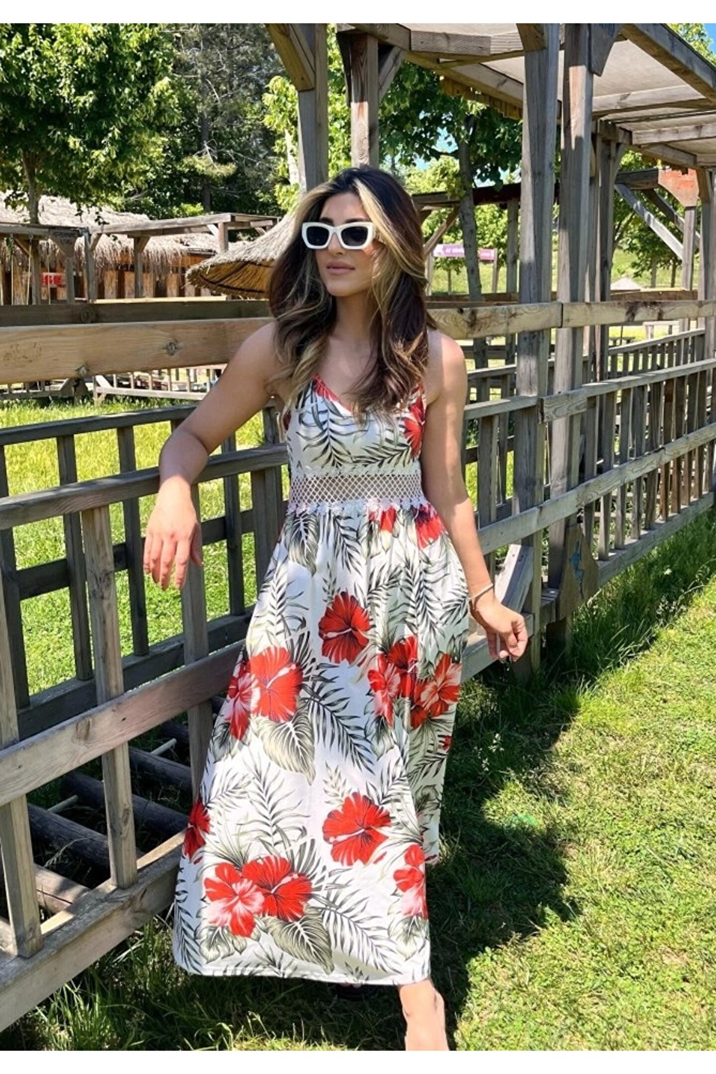 Silerra Kadın Ip Askılı V Yakalı Bel Güpür çiçek Desenli Yandan Yırtmaçlı Maksi Süprem Elbise