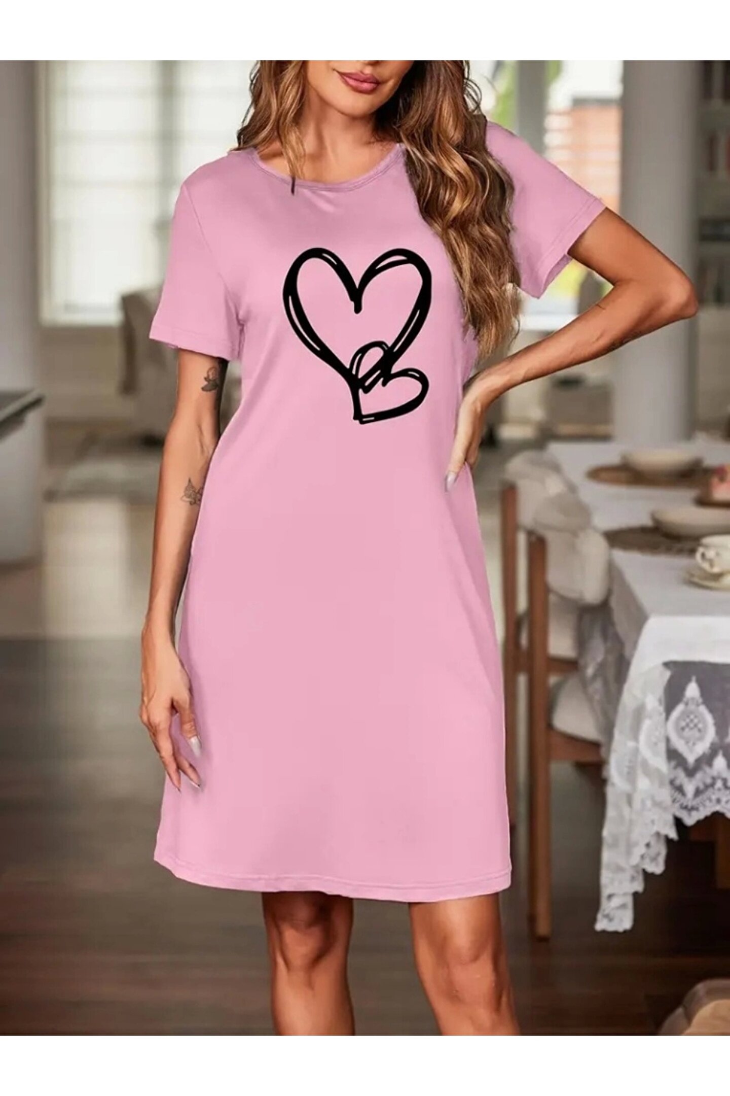 Kadın Kısa Kollu Bisiklet Yaka Kalp Desenli Viskon Elbise