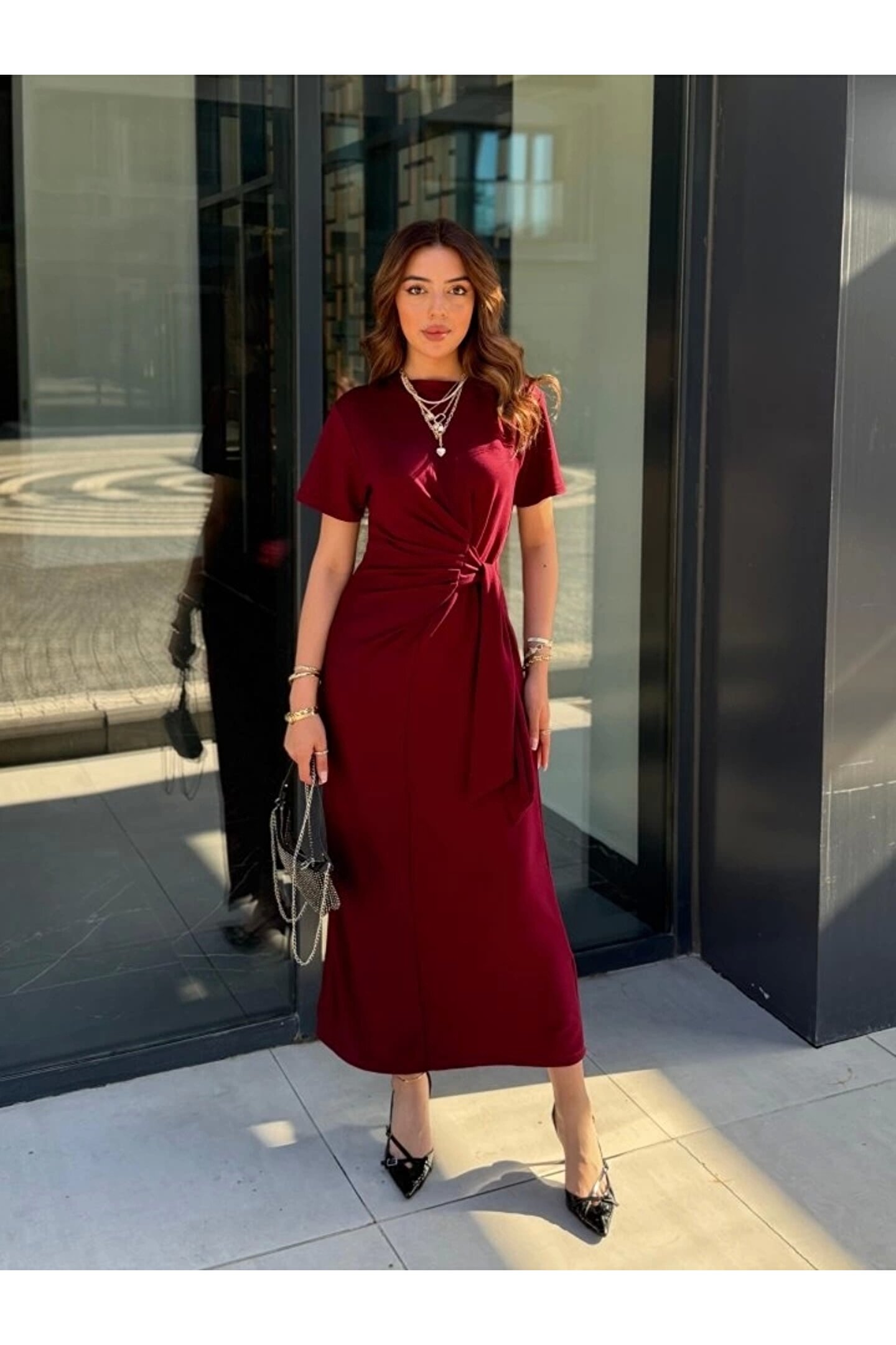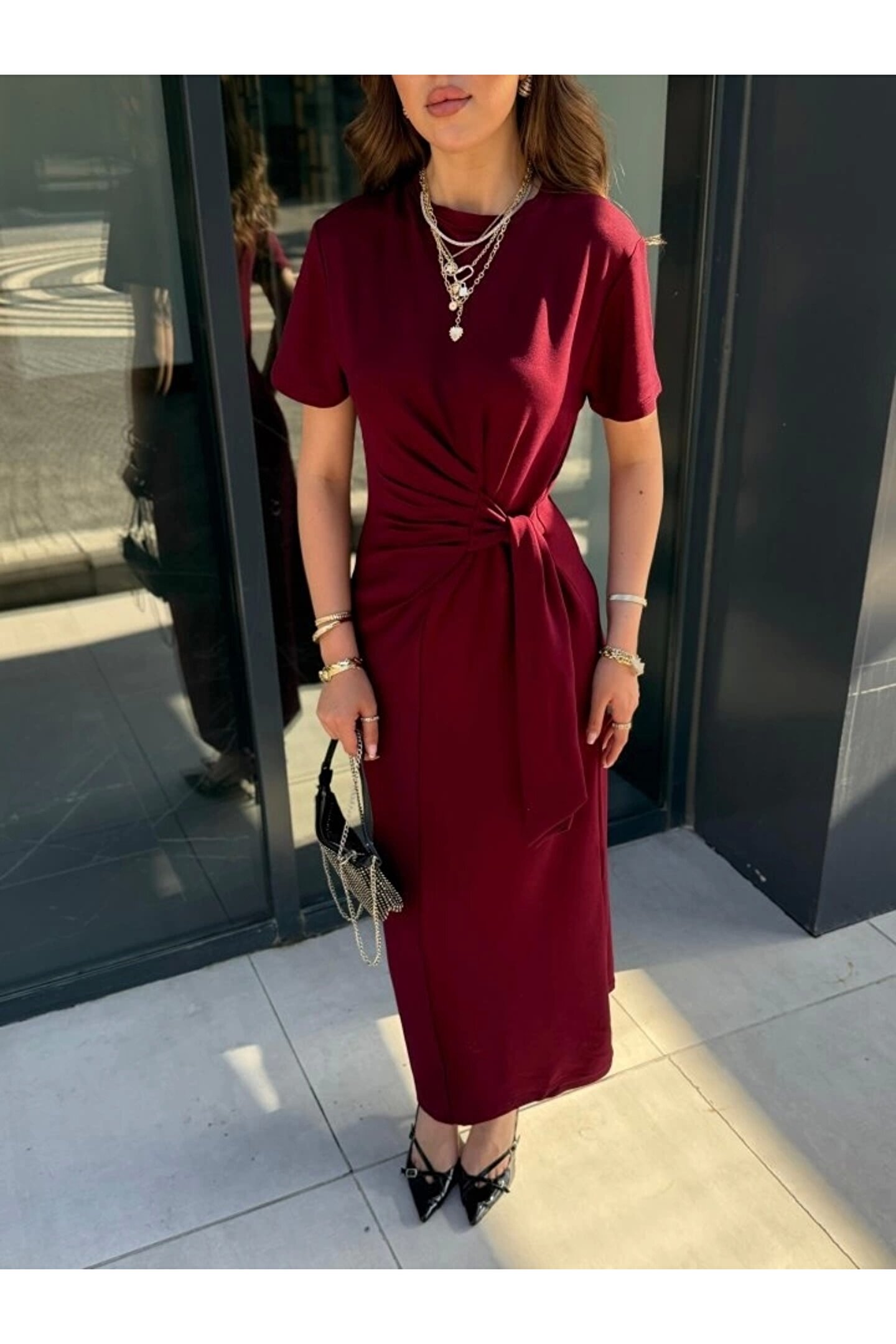 Kadın Kısa Kollu Bisiklet Yaka Yandan Bağlamalı Viskon Iki Iplik Elbise
