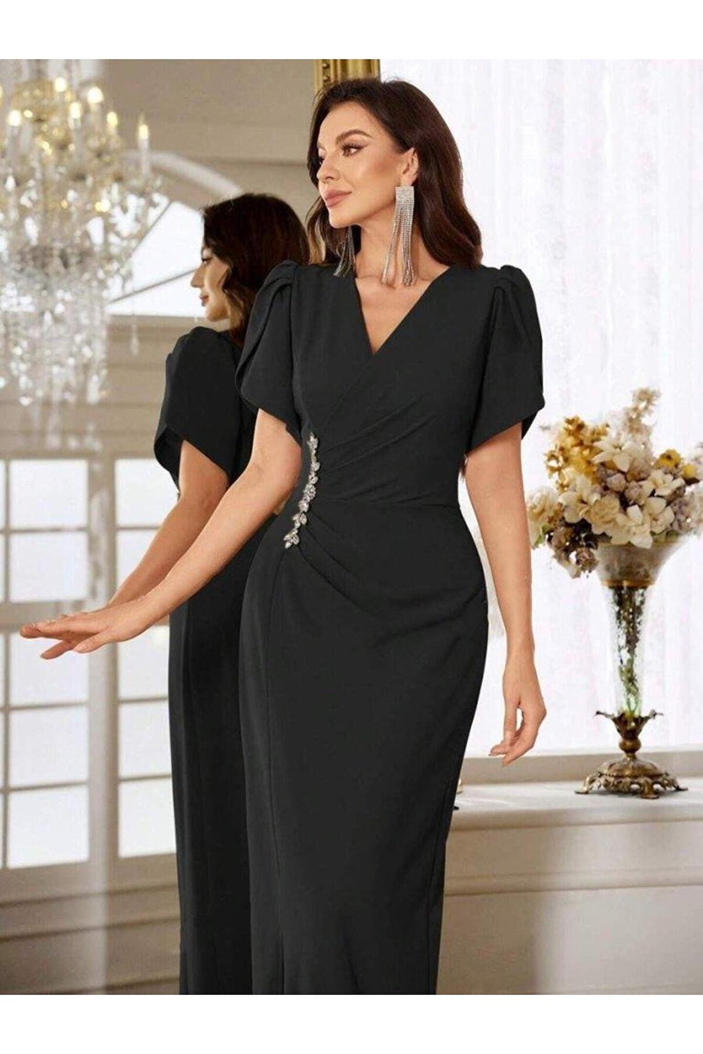 Kadın Kısa Kollu Kruvaze Yakalı Belden çiçek Aksesuarlı Yırtmaçlı Ithal Krep Elbise