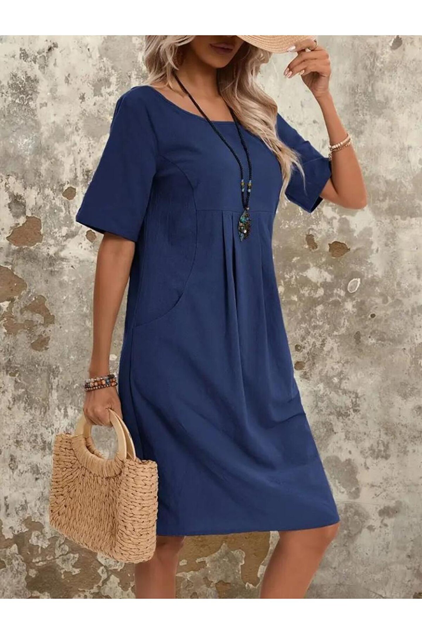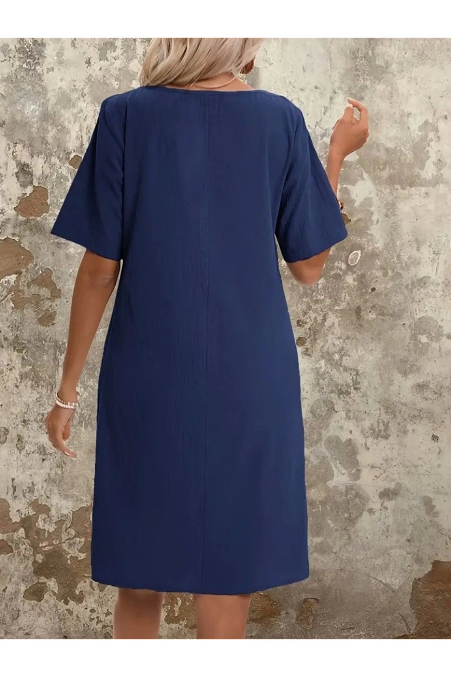 Kadın Kısa Kollu Yakası Açık önden Büzgülü Cep Detaylı Viskon Iki Iplik Elbise
