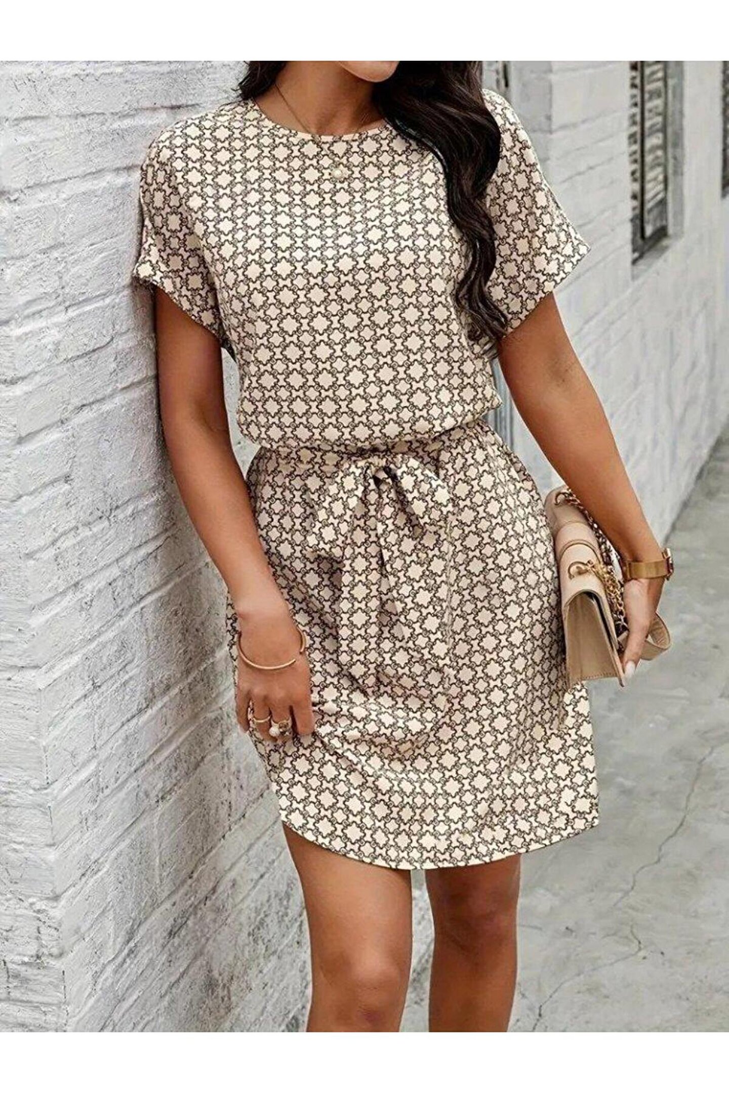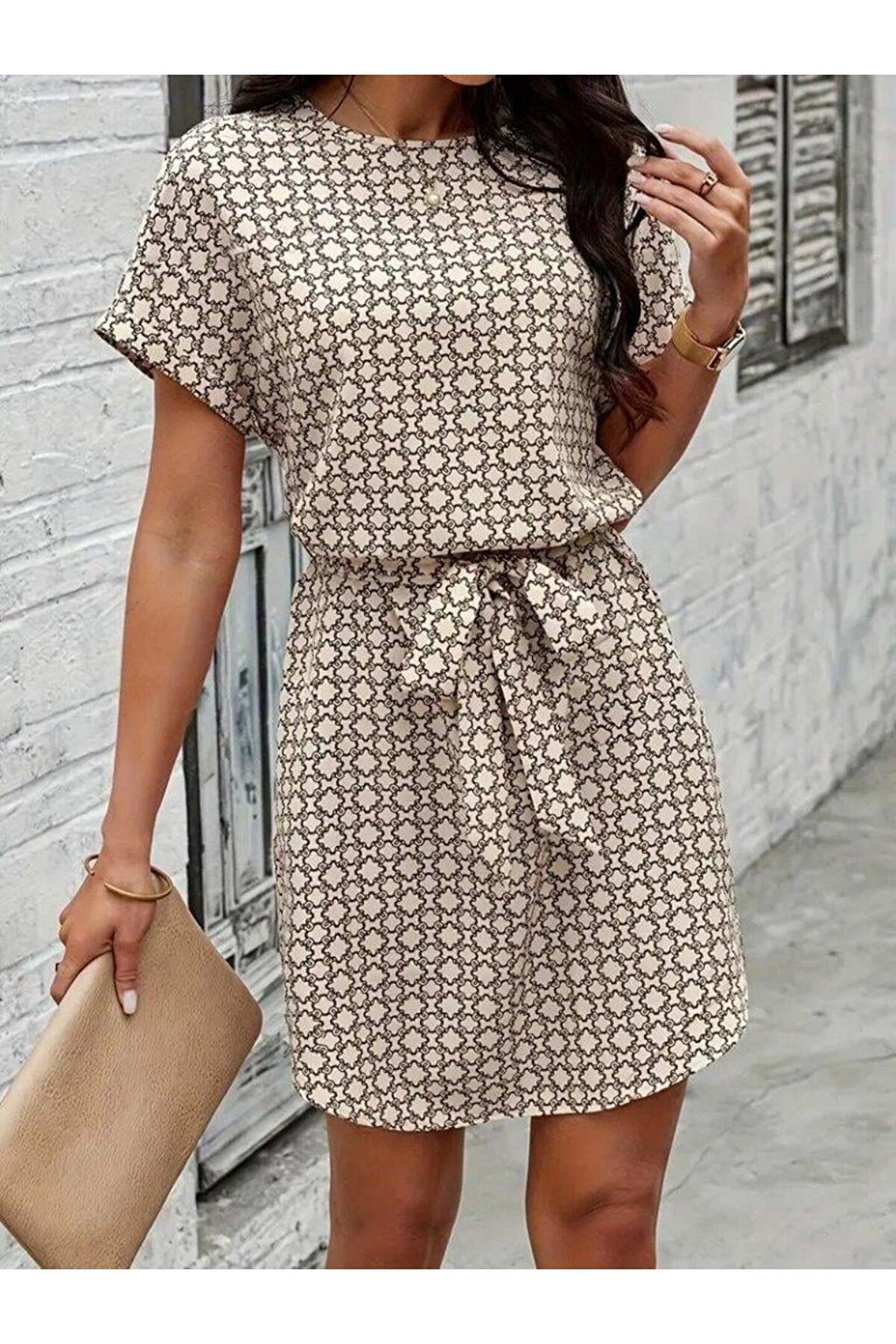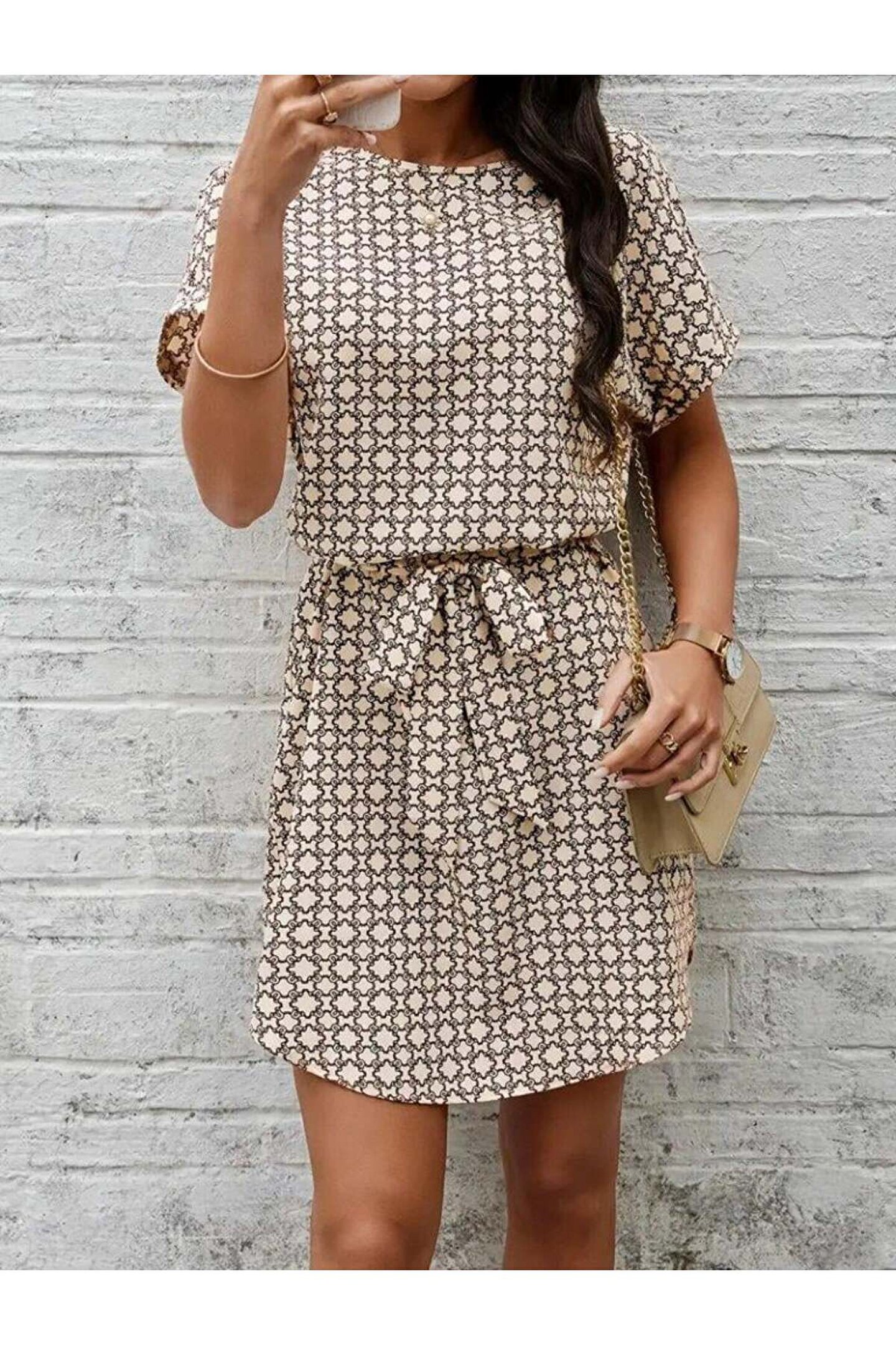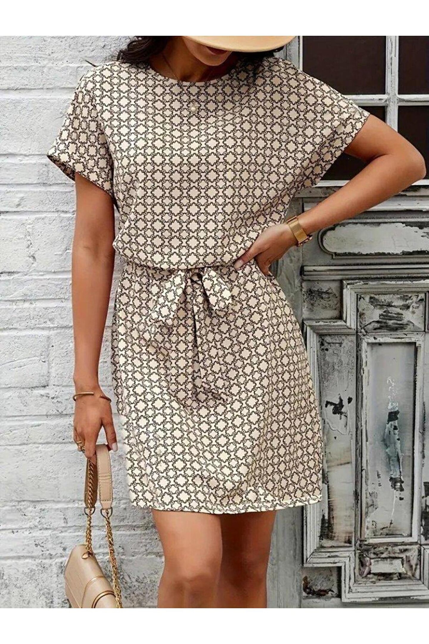 Kadın Kısa Kollu Yuvarlak Yaka Beli Kuşaklı Geometrik Desenli Süprem Elbise