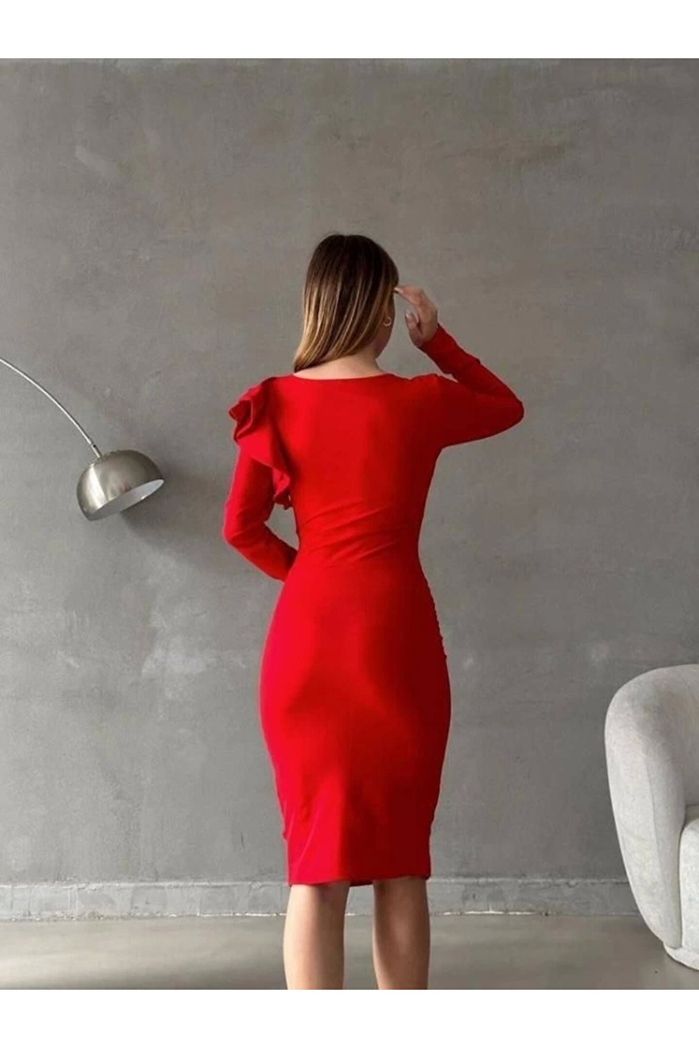 Kadın Kruvaze Yaka Volan Detay Midi Boy Fırsat ürün Elbise