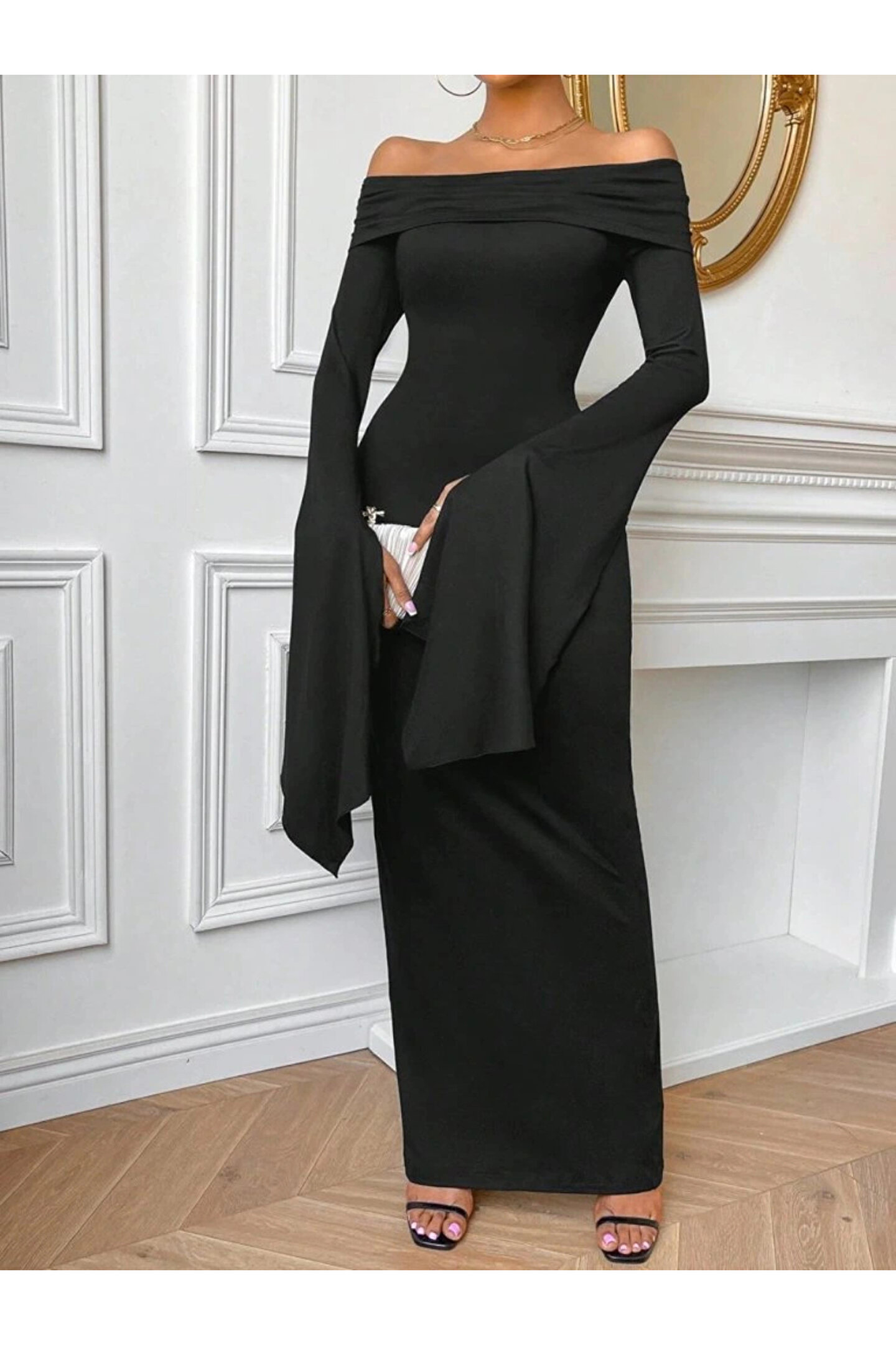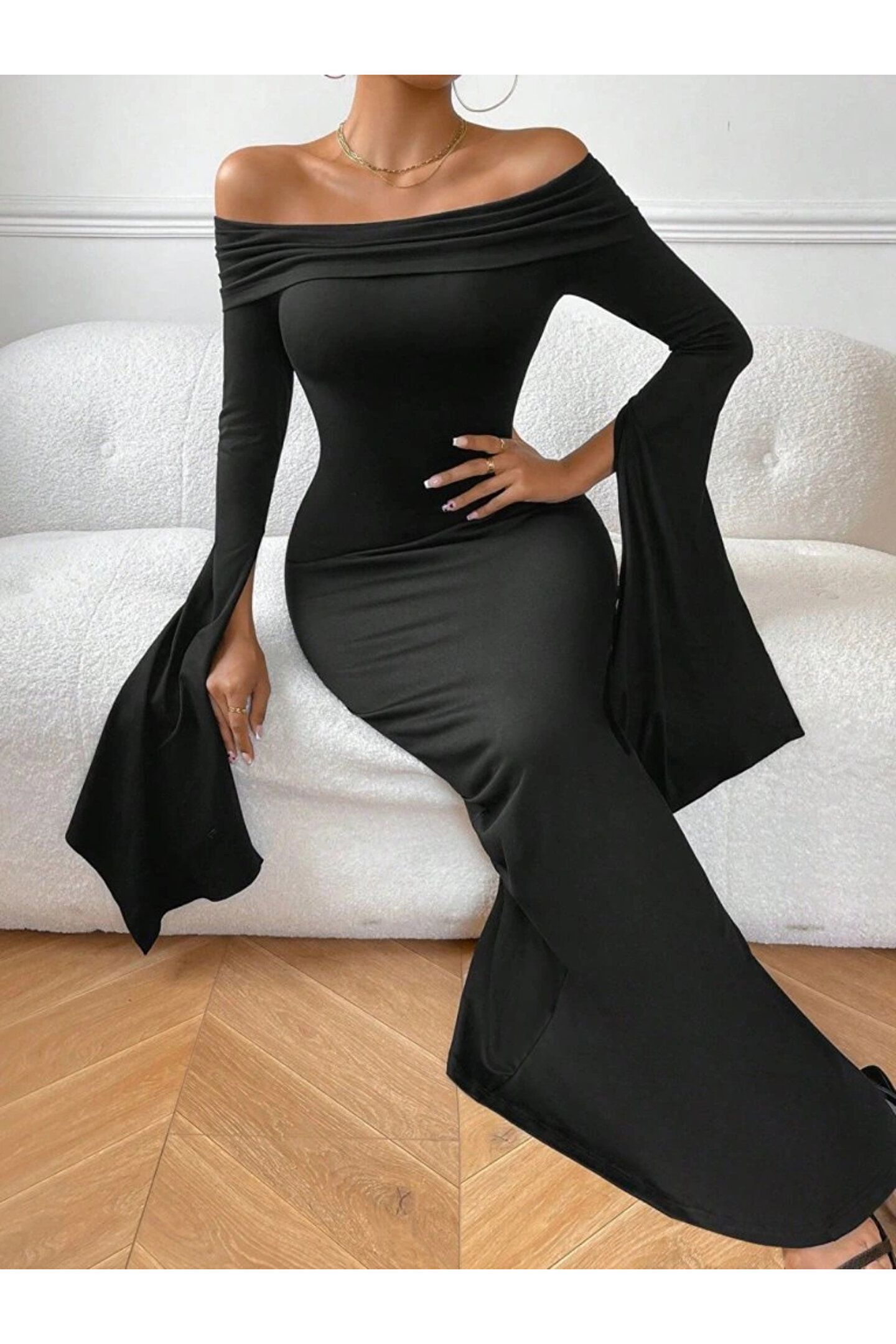 Kadın Madonna Yaka Uzun Yırtmaç Kol Detaylı Uzun Ithal Krep Elbise