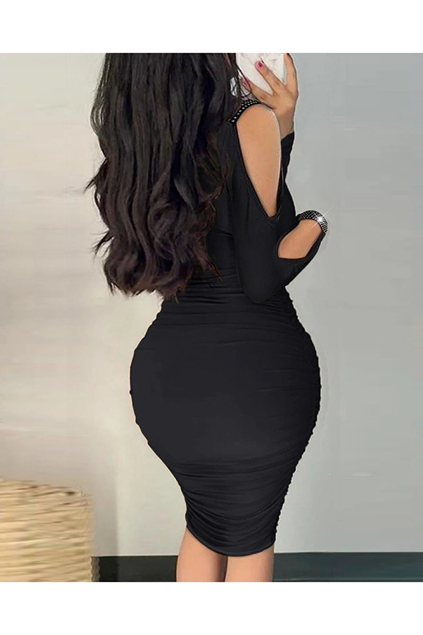 Kadın Omuzlardan Açık Uzun Kollu Taşlı Degaje Yakalı Sandy Midi Elbise