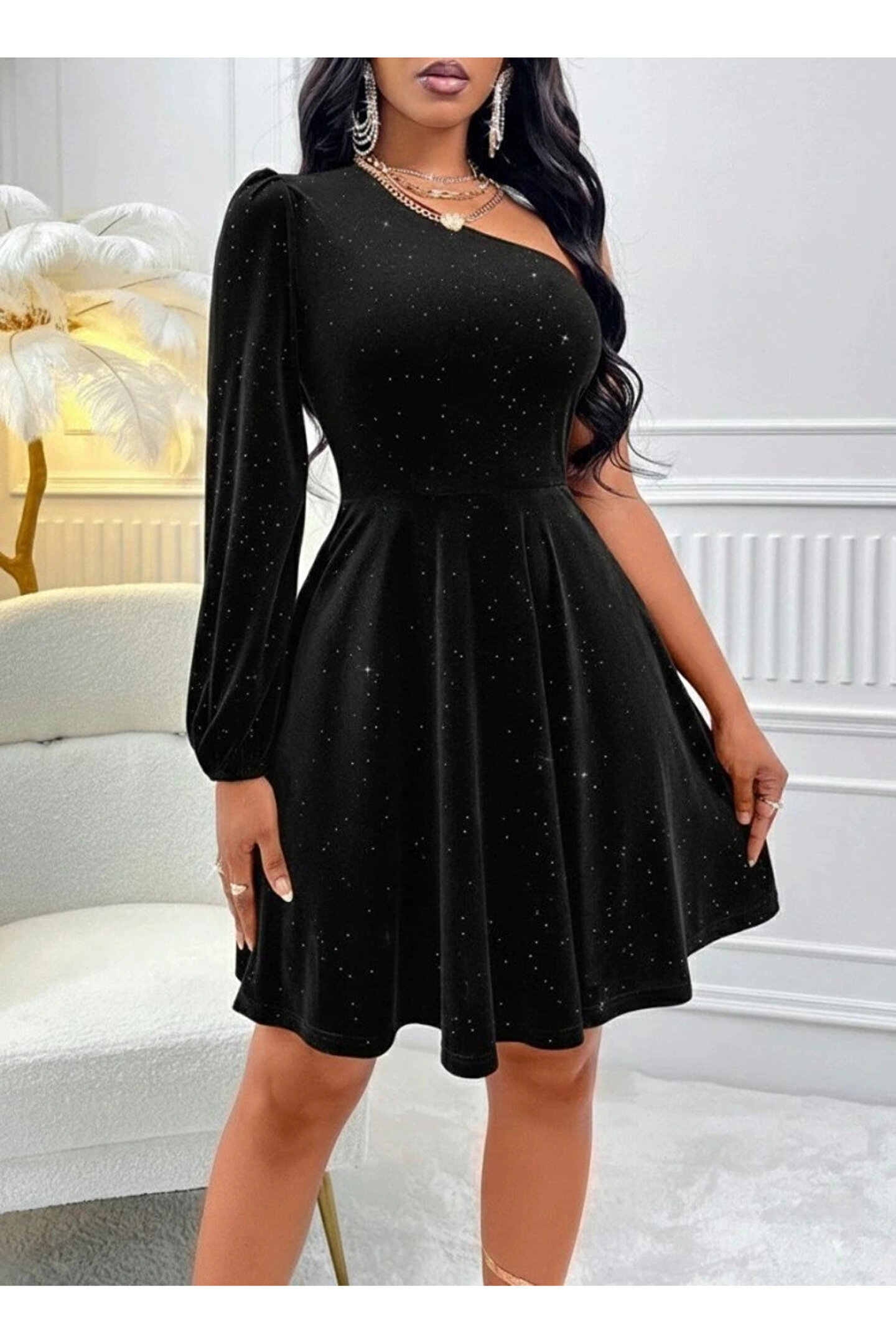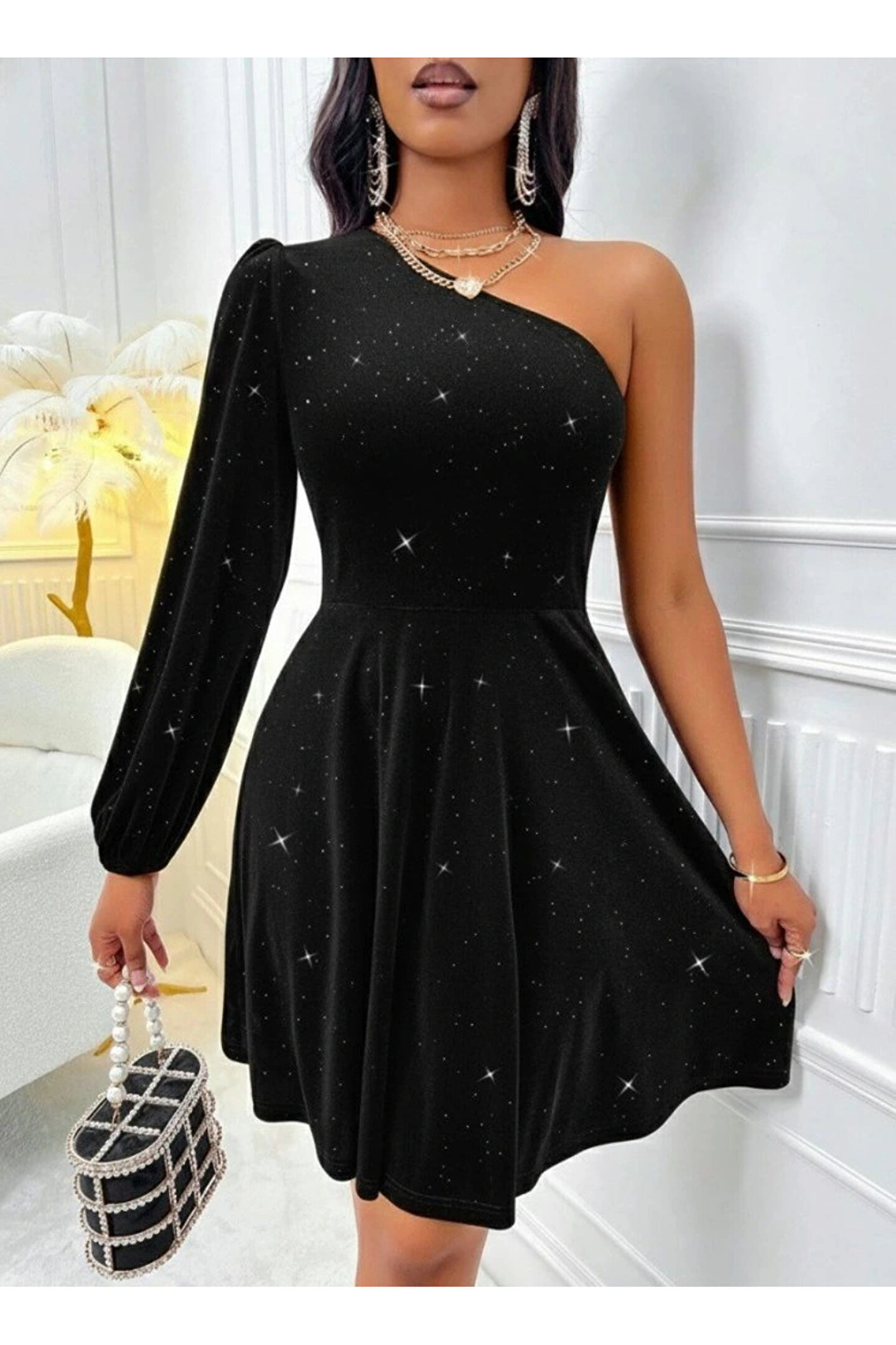 Kadın Tek Omuzdan Açık Uzun Kollu Taşlı Mini Elbise