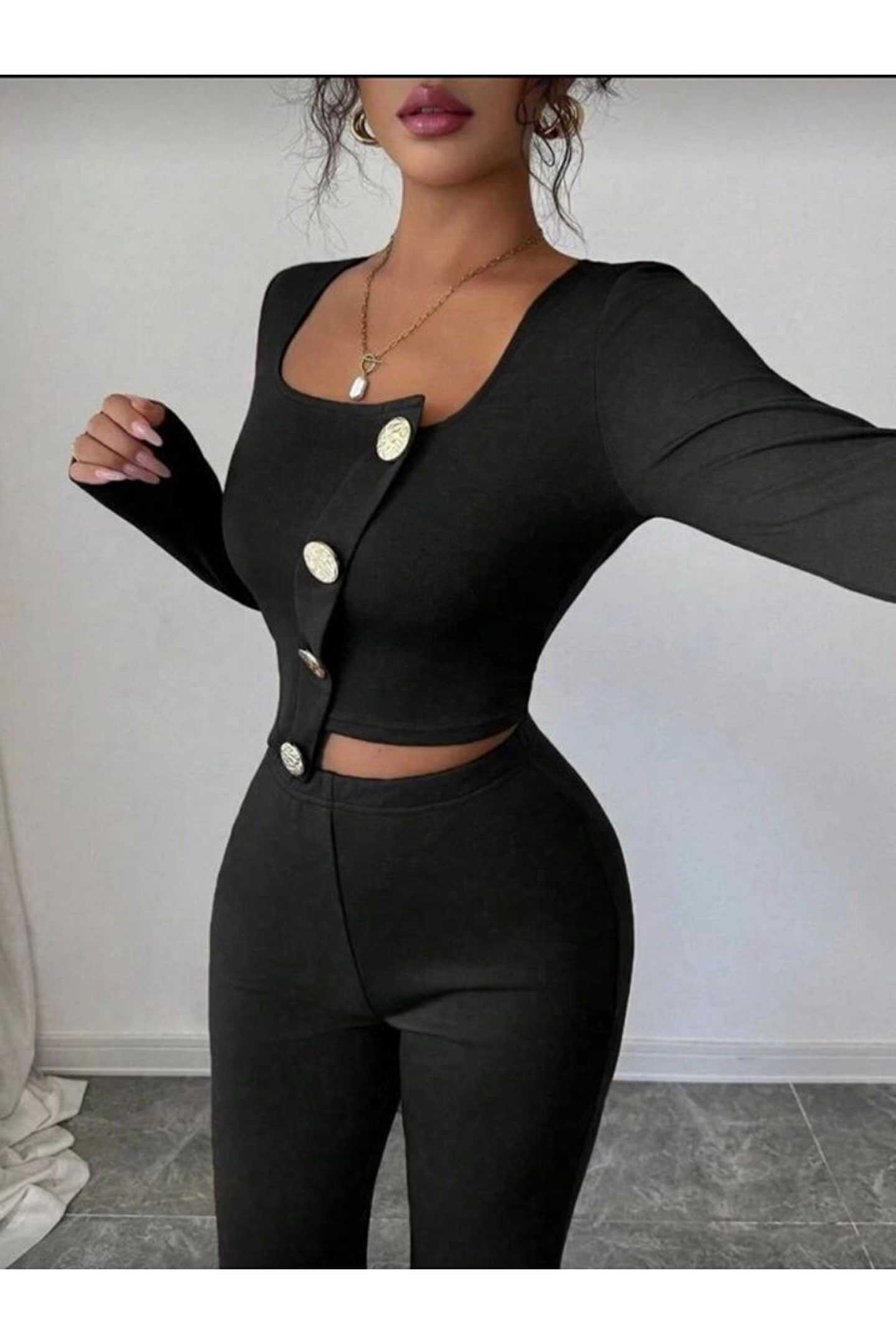 Kadın Uzun Kol Kare Yaka Asimetrik Düğme Detay Bluz Ve Yüksek Bel Pantolon Ikili Takım