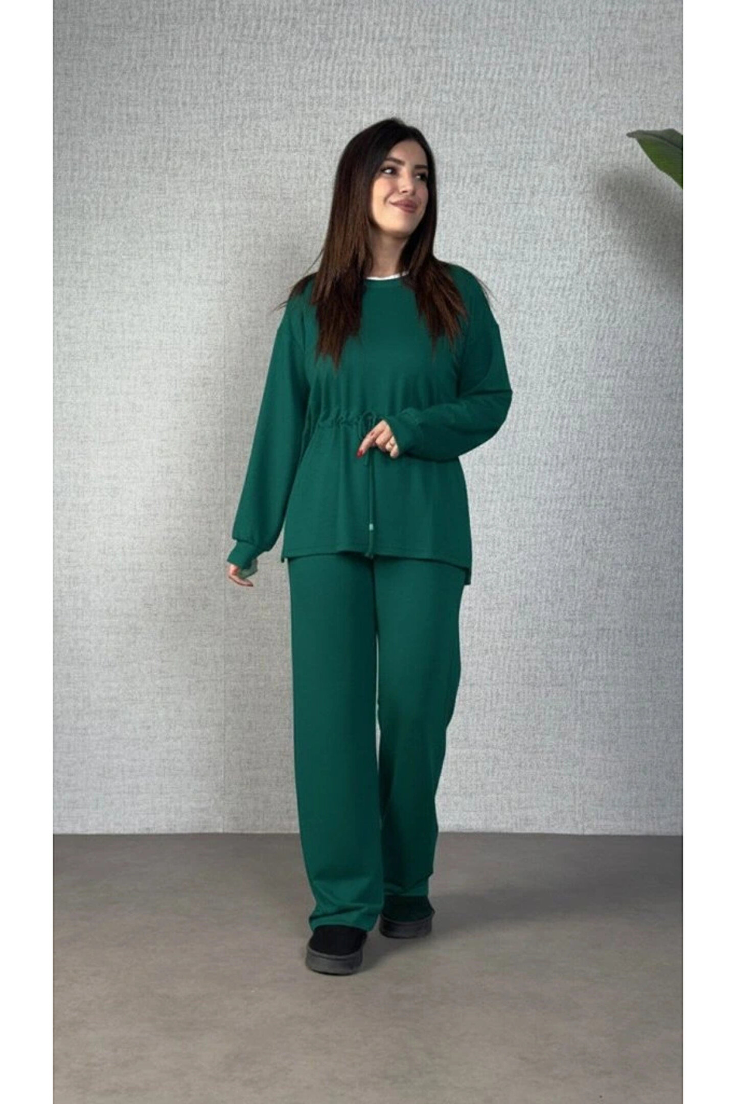 Kadın Uzun Kollu Bisiklet Yaka Belden Büzgülü Bağcıklı Viskon Iki Iplik Bluz Ve Pantolon Ikili Takım