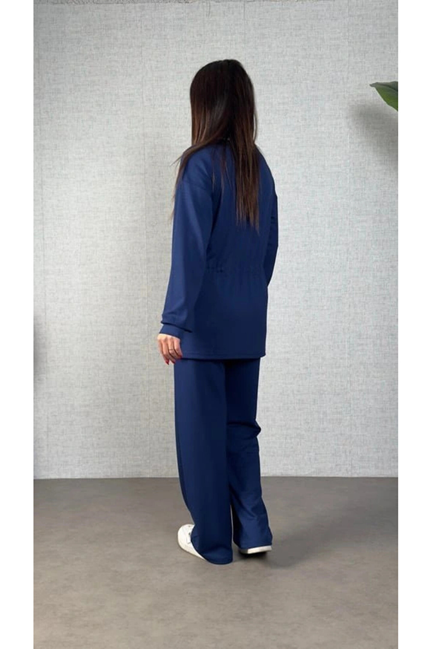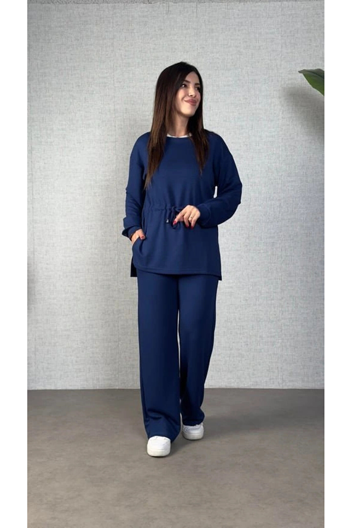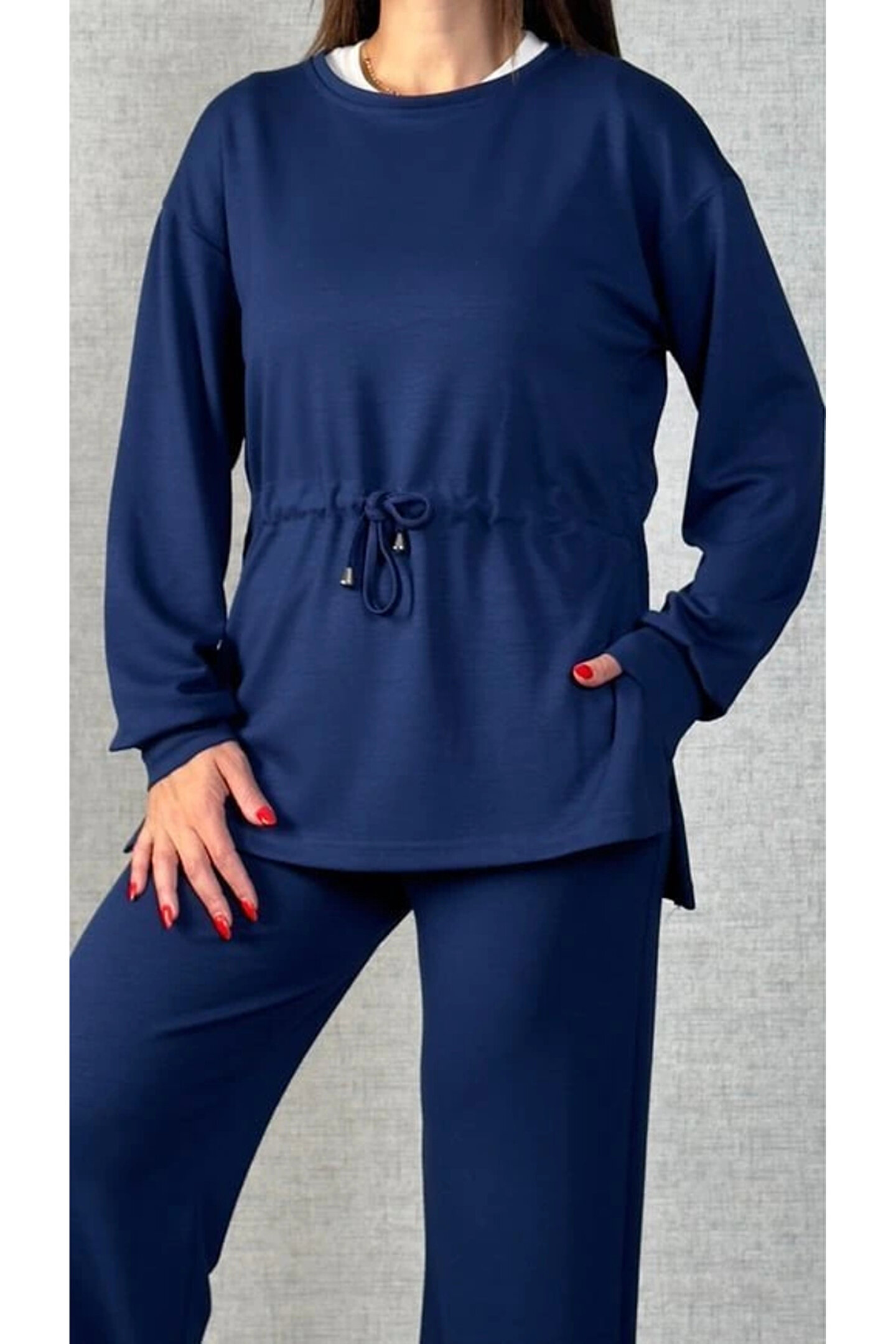 Kadın Uzun Kollu Bisiklet Yaka Belden Büzgülü Bağcıklı Viskon Iki Iplik Bluz Ve Pantolon Ikili Takım