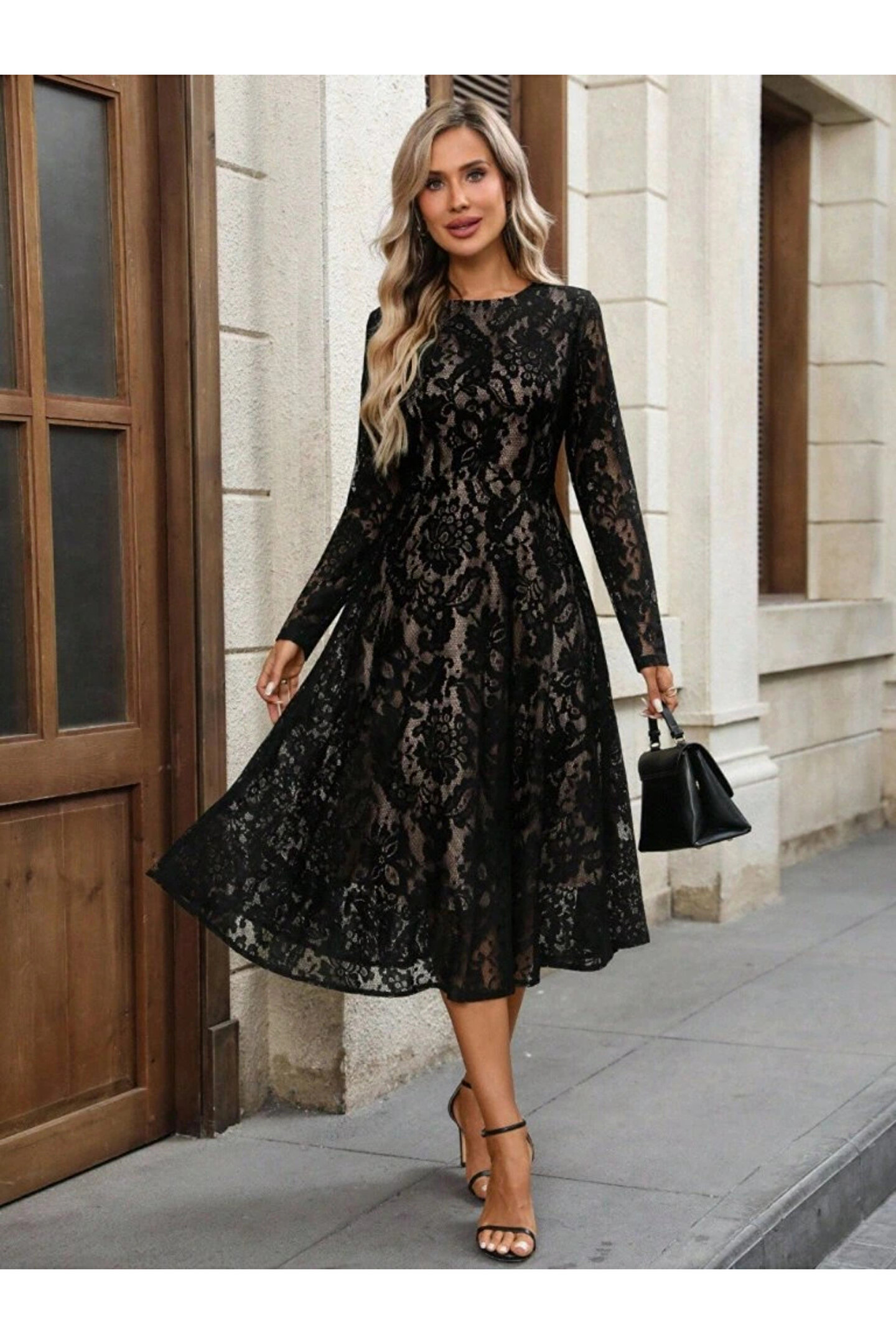 Kadın Uzun Kollu Bisiklet Yaka Dantelli Astarlı Midi Elbise