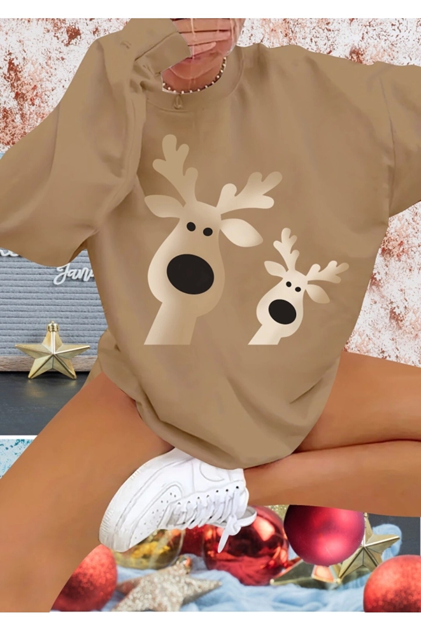Silerra Kadın Uzun Kollu Bisiklet Yaka Geyik Desenli Viskon Iki Iplik Bluz