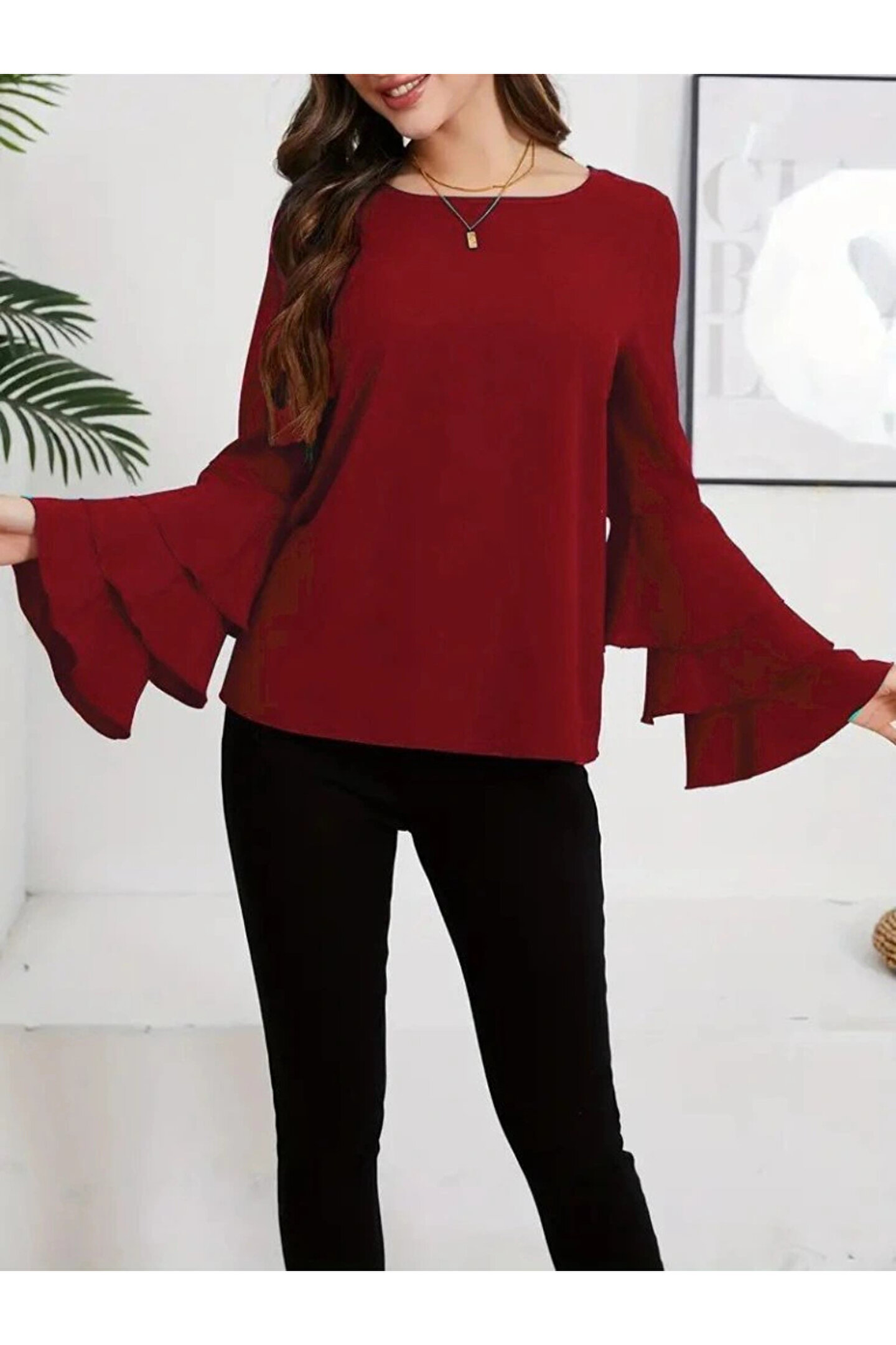 Kadın Uzun Kollu Bisiklet Yaka Kollar İspanyol Volanlı Sandy Bluz