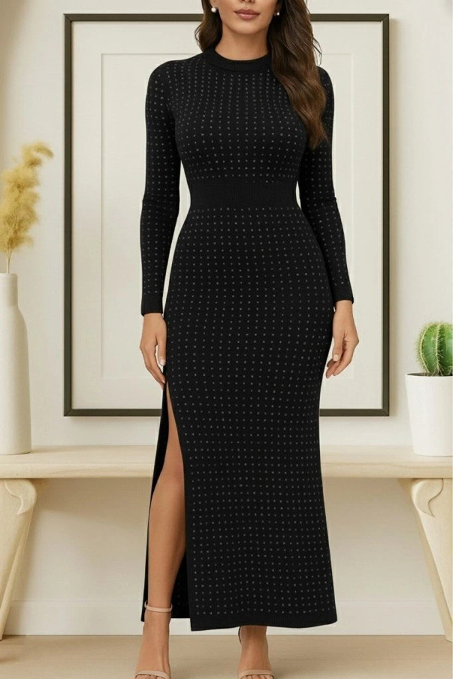 Silerra Kadın Uzun Kollu Bisiklet Yaka Taşlı Midi Kadife Elbise