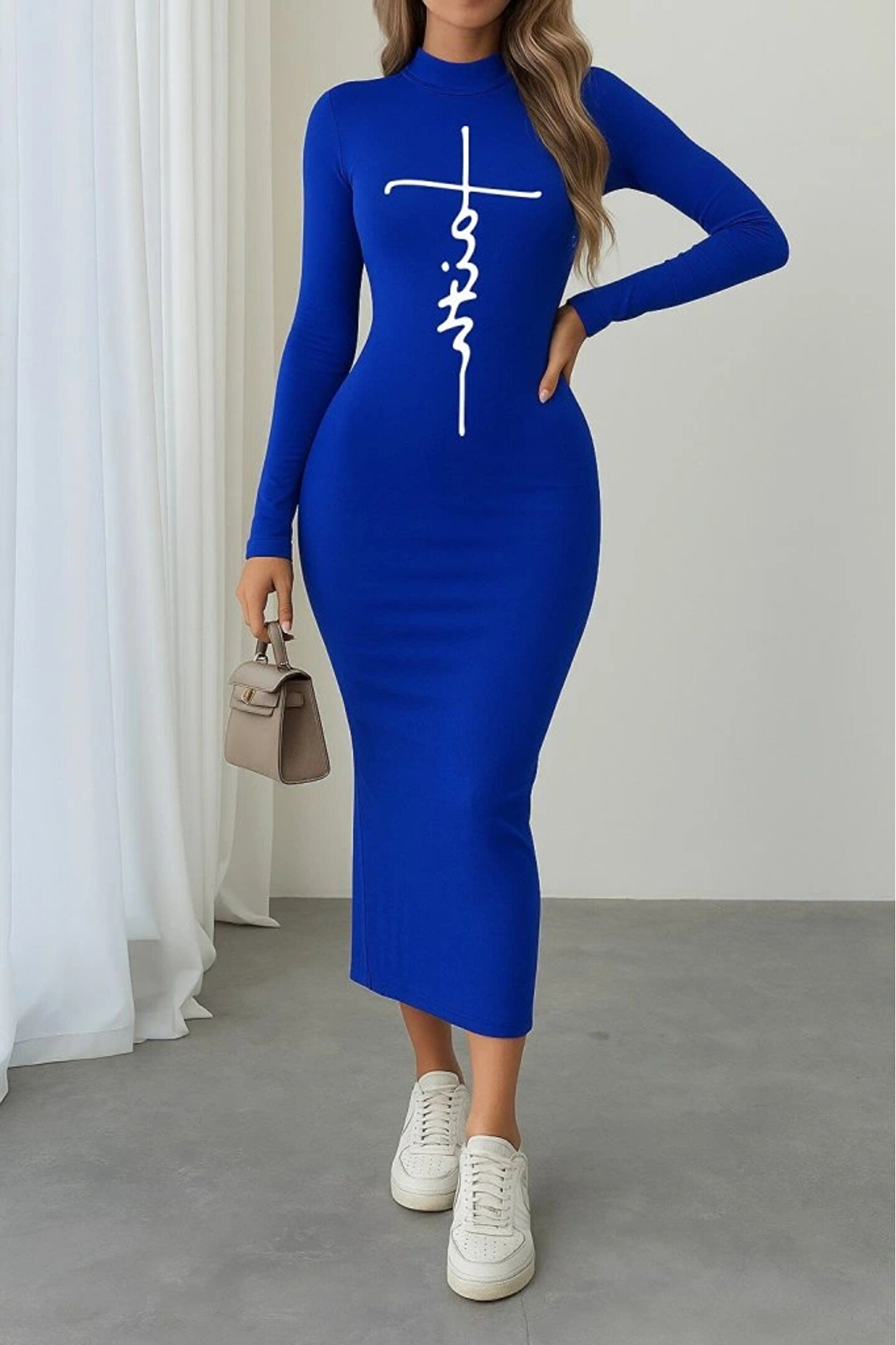 Kadın Uzun Kollu Boğazlı Baskı Detaylı Viskon Tam Boy Elbise