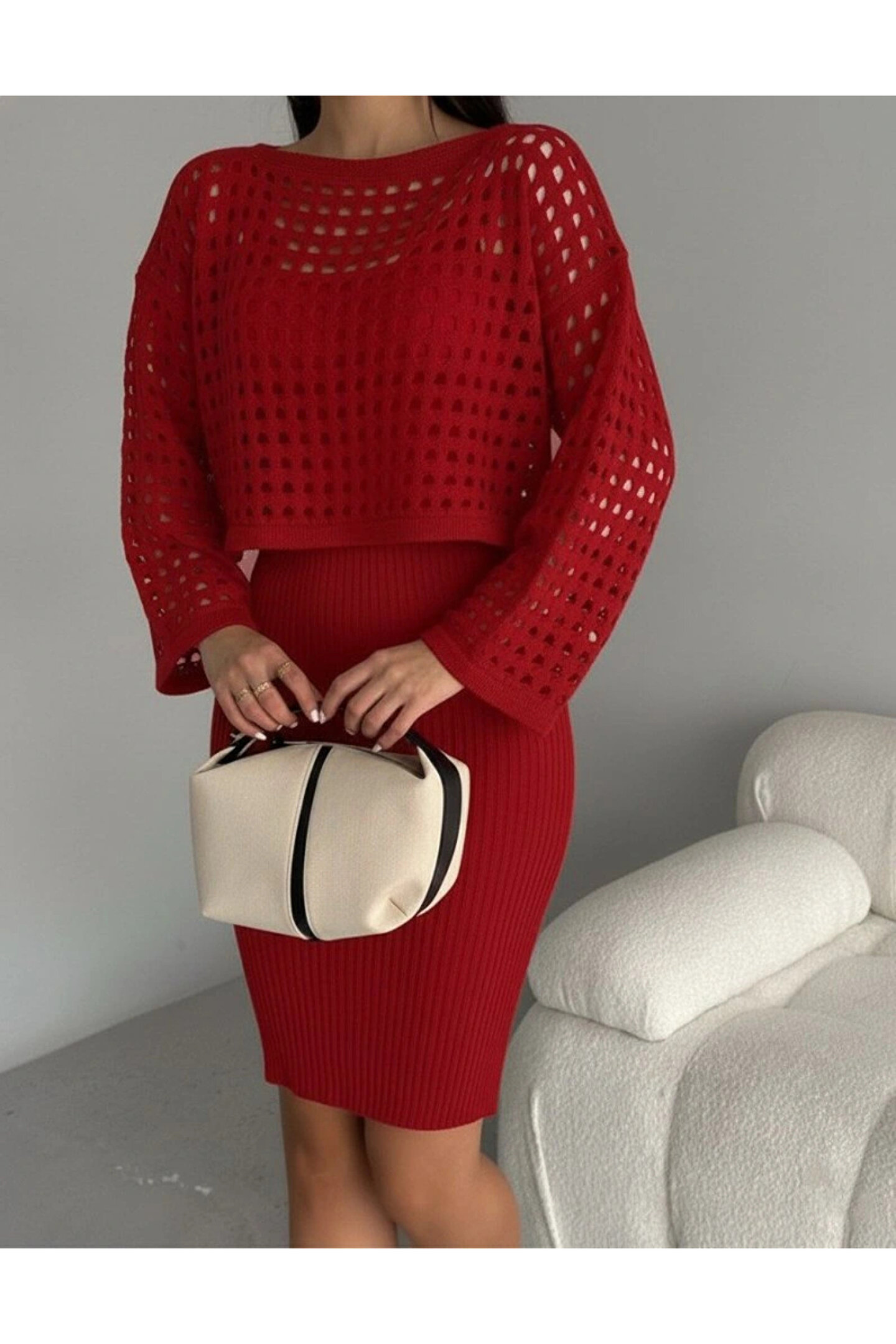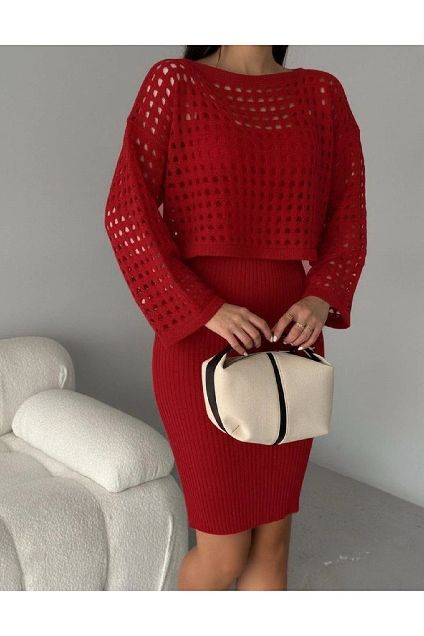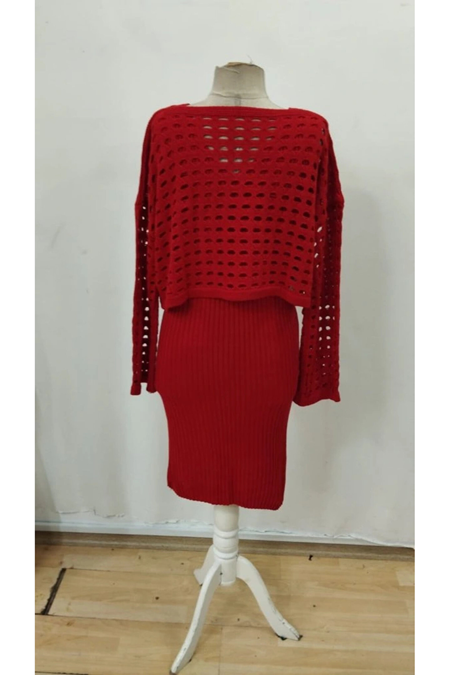 Kadın Uzun Kollu Delikli Kazak Askılı Elbise Triko Ikili Takım