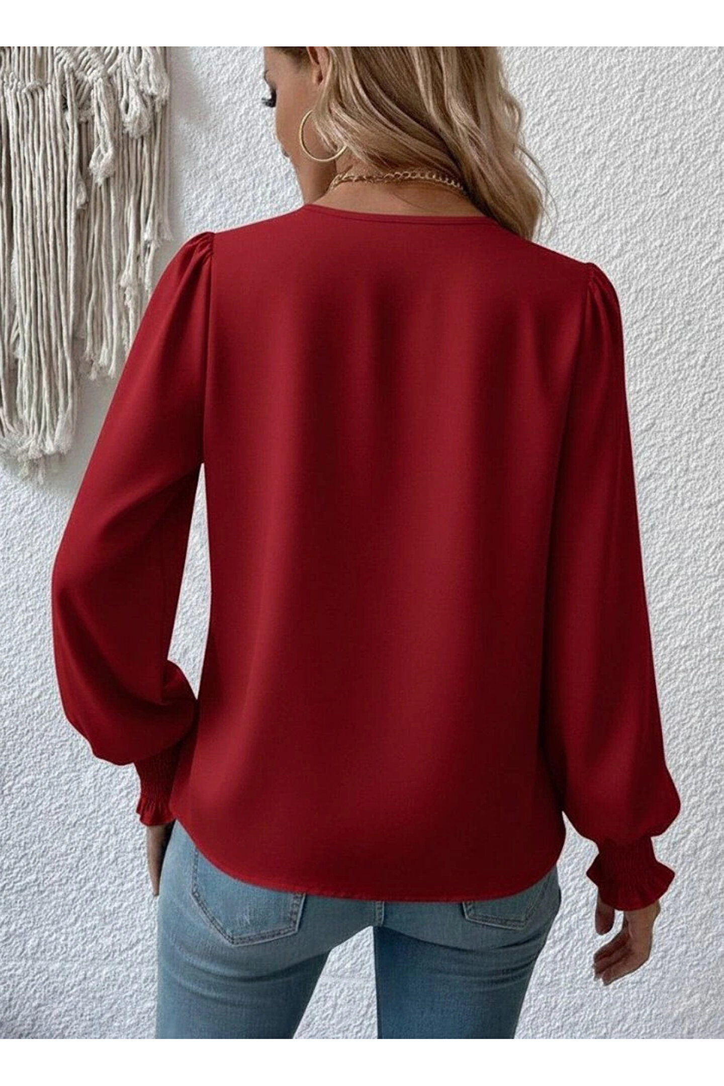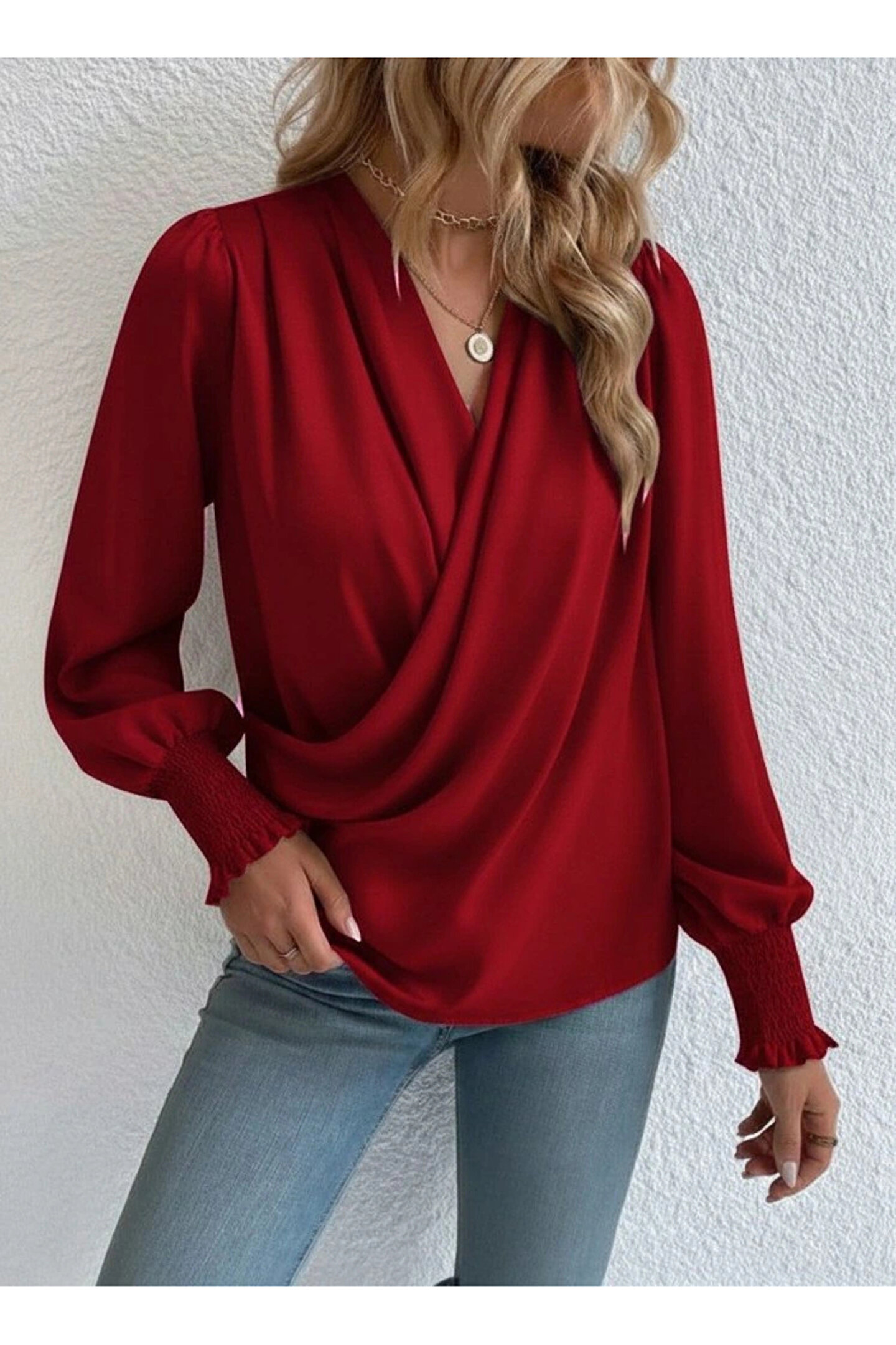 Kadın Uzun Kollu Dökümlü Kruvaze Yaka Kol Ucu Gipeli Sandy Bluz
