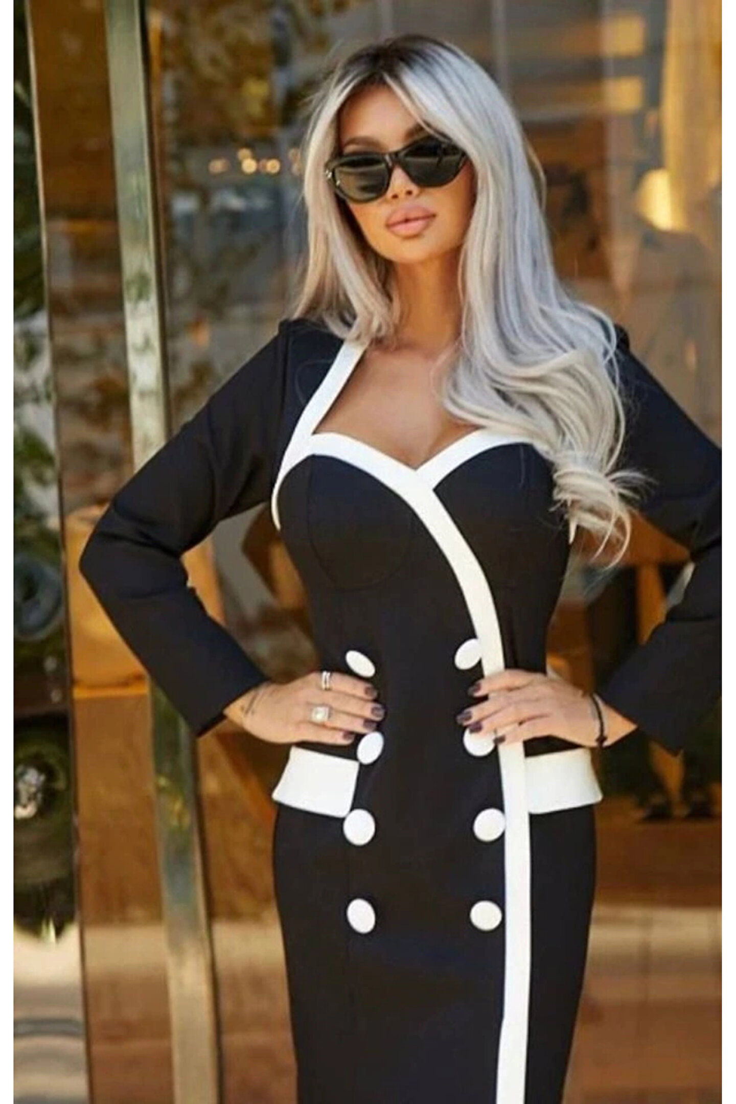 Kadın Uzun Kollu Kalp Yaka Kaplama Düğme Ve Cep Detay Elbise