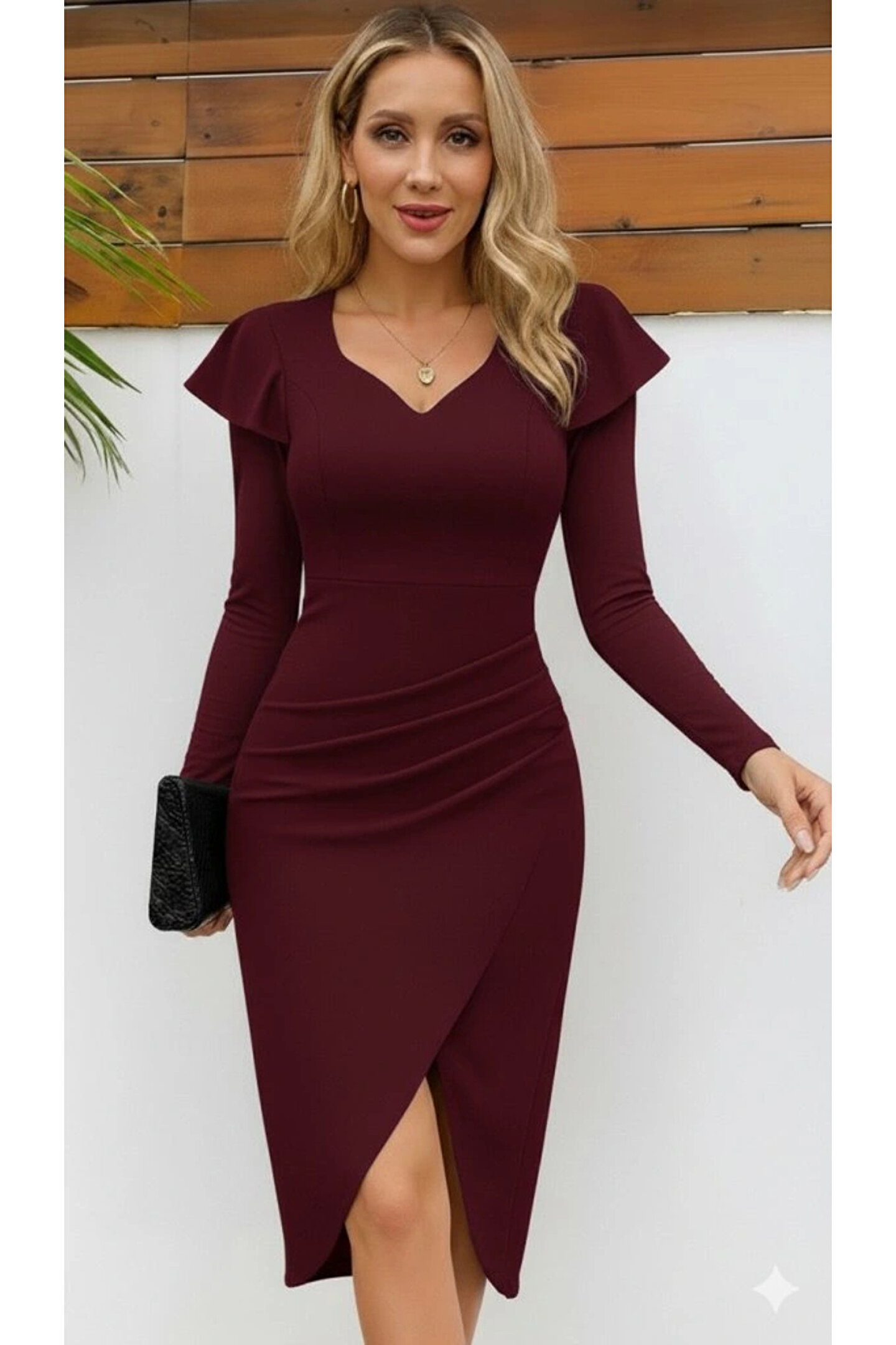 Kadın Uzun Kollu Kalp Yaka önden çapraz Detaylı Midi Ithal Krep Elbise