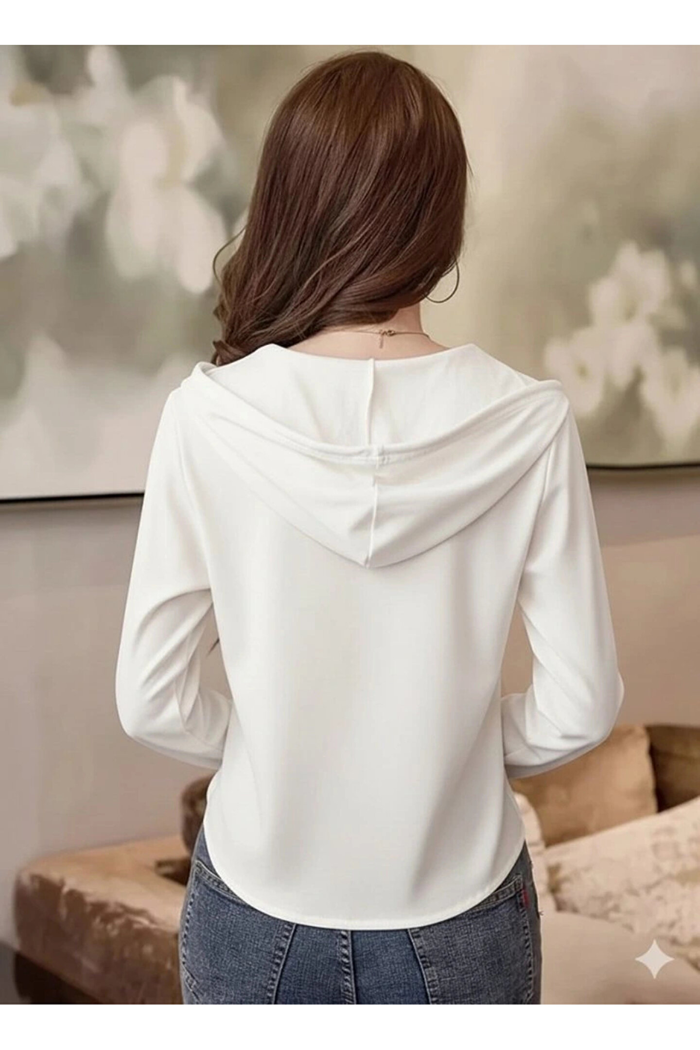 Kadın Uzun Kollu Kapşonlu Bağcıklı Düğmeli Viskon Iki Iplik Bluz