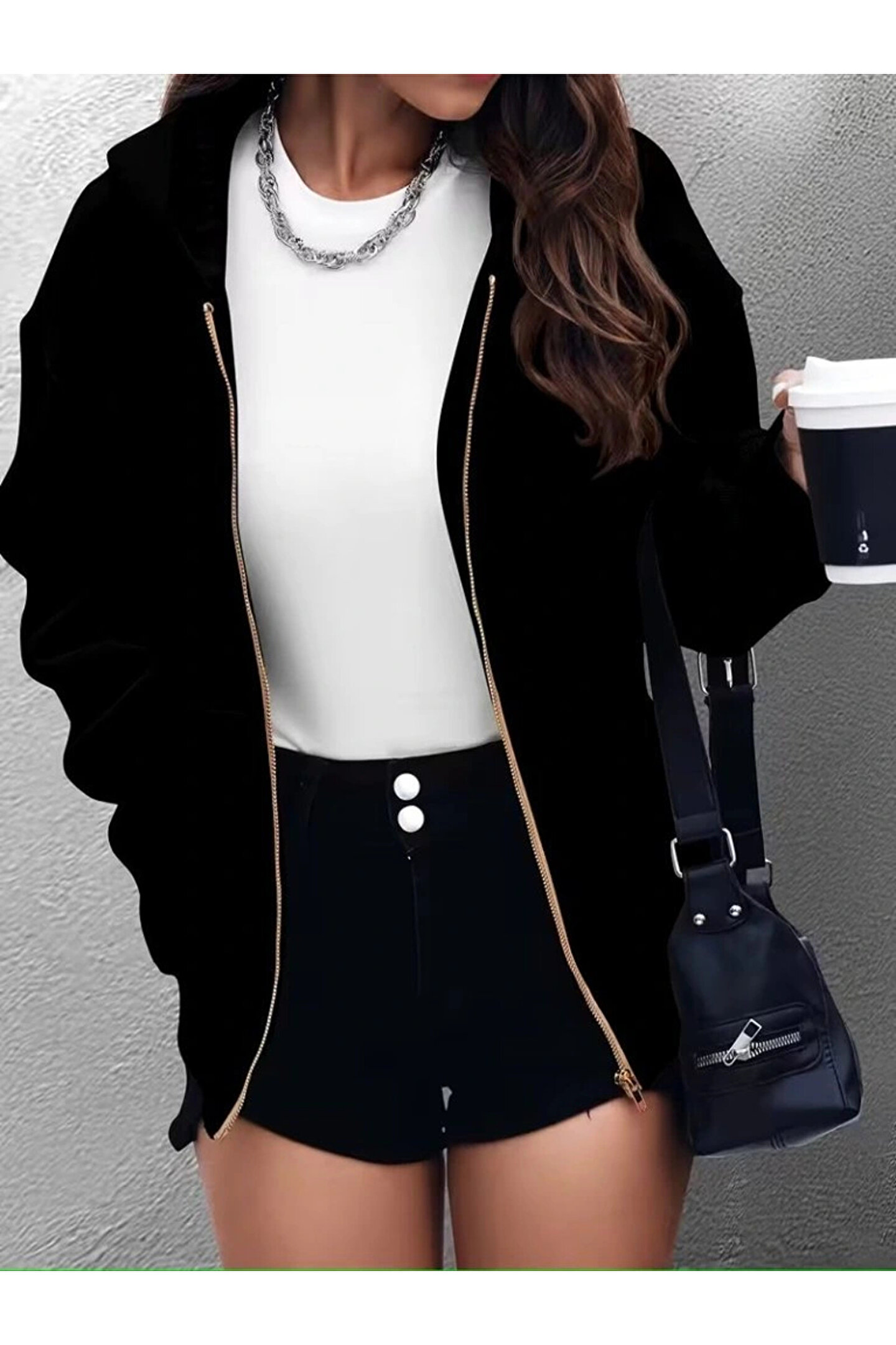 Kadın Uzun Kollu Kapşonlu Fermuarlı önden Cep Detaylı şardonlu Iki Iplik Ceket