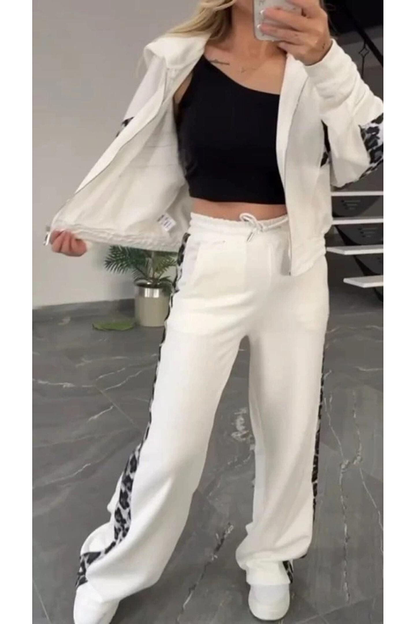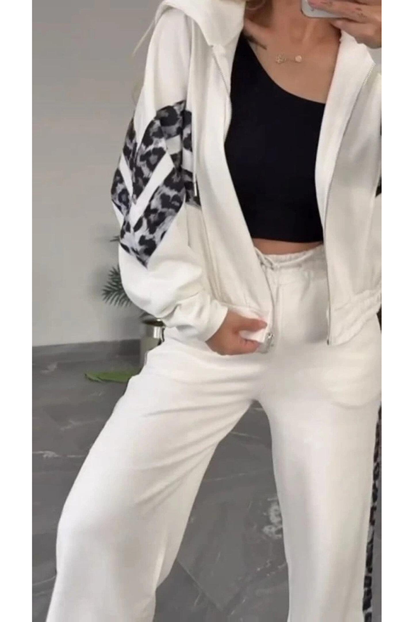 Kadın Uzun Kollu Kapşonlu önü Fermuarlı Leopar Desenli Modal Bluz Ve Pantolon Ikili Takım