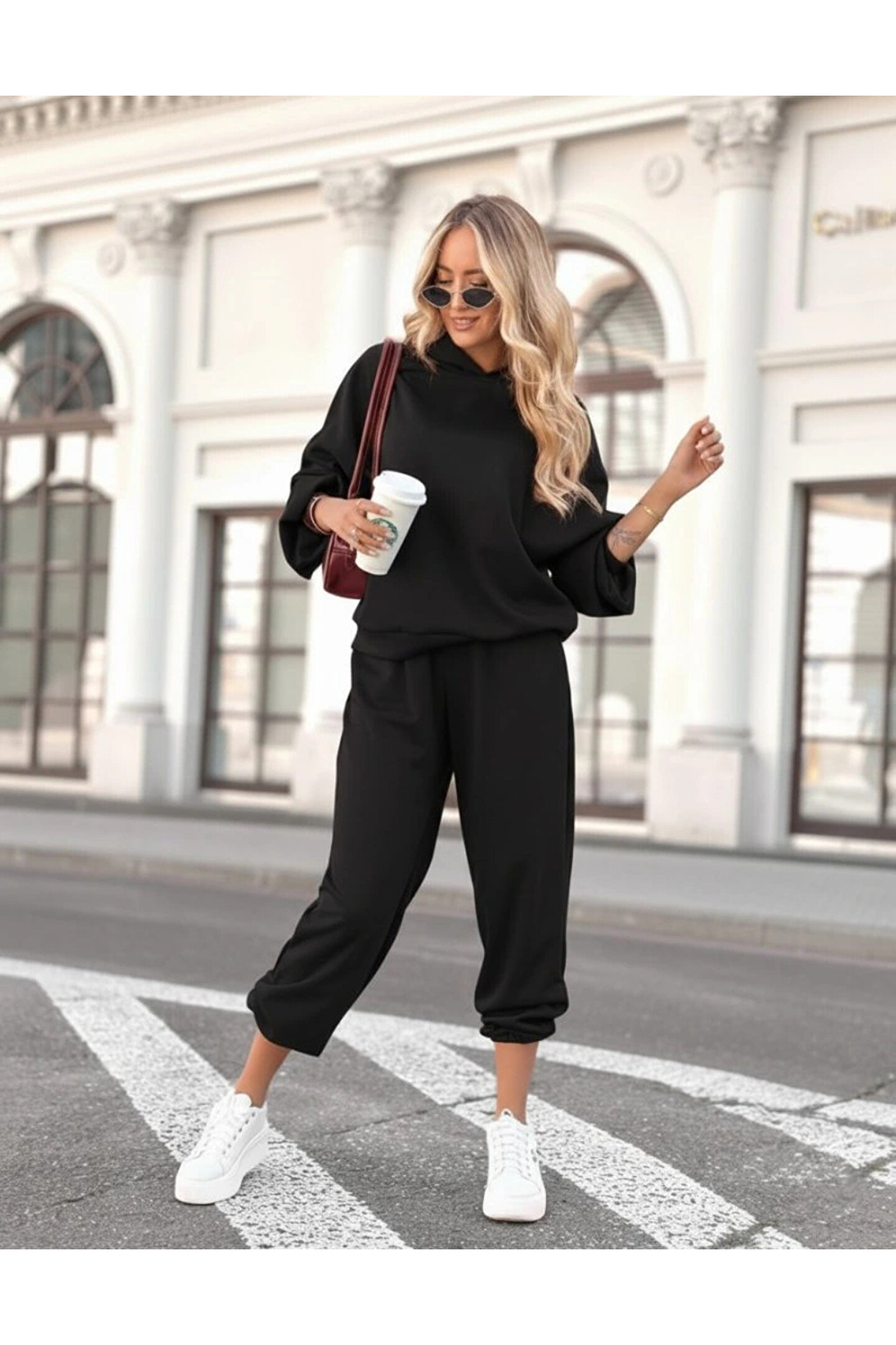 Kadın Uzun Kollu Kapşonlu Viskon Iki Iplik Bluz Ve Pantolon Ikili Takım